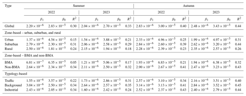 Finally, we present in Table 6 a seasonal analysis that covers all recorded values from 2022 and 2023 and provides a detailed view of how seasonal factors – such as temperature and atmospheric conditions – affect both the r correlation and the coefficient of variation (CV) between satellite and surface measurements of NO2 throughout the year. Additionally, Tables 7 and 8 summarize the regression analysis results, including β1, β0, and R2 for NO2 measurements across different seasons and typologies, highlighting the seasonal variability observed in the data.