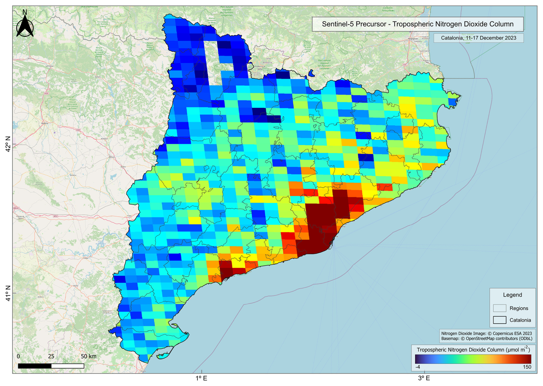 Figure 2Tropospheric nitrogen dioxide column over Catalonia, measured by the Sentinel-5 Precursor satellite during the period 11–17 December 2023. Values are expressed in µmol m−2.