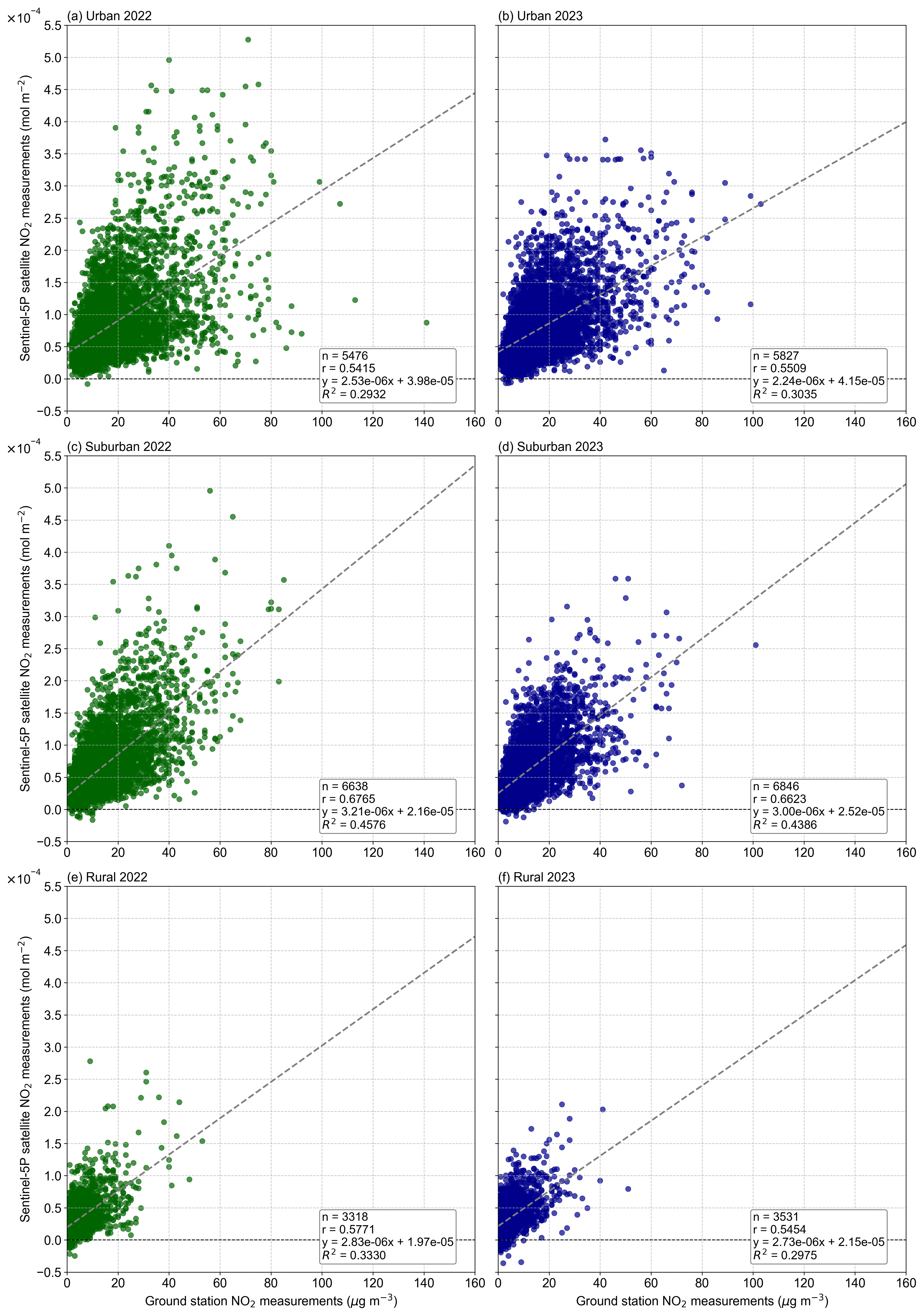 Correlation plots. These plots visually represent the relationship between satellite- and ground-based NO2 measurements, helping identify patterns, trends, and outliers. They provide a visual basis for assessing the linearity and differences across geographic and seasonal contexts (Boslaugh and Watters, 2008; Kutner et al., 2004).