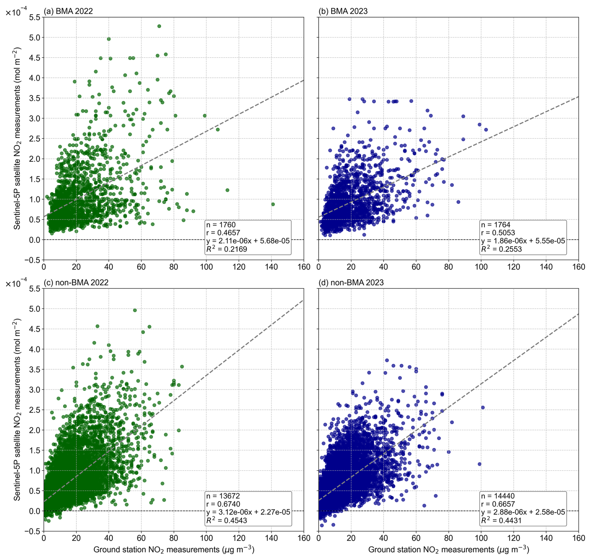 Figure 6Scatter plots comparing NO2 concentrations measured by Sentinel-5P (mol m−2) and ground-based stations (µg m−3) from the XVPCA network in Catalonia for 2022 and 2023, grouped by BMA and non-BMA zones: (a) BMA 2022, (b) BMA 2023, (c) non-BMA 2022, and (d) non-BMA 2023. Each panel includes the linear regression line with its corresponding equation, the number of data points (n), the Pearson correlation coefficient (r), and the coefficient of determination (R2).