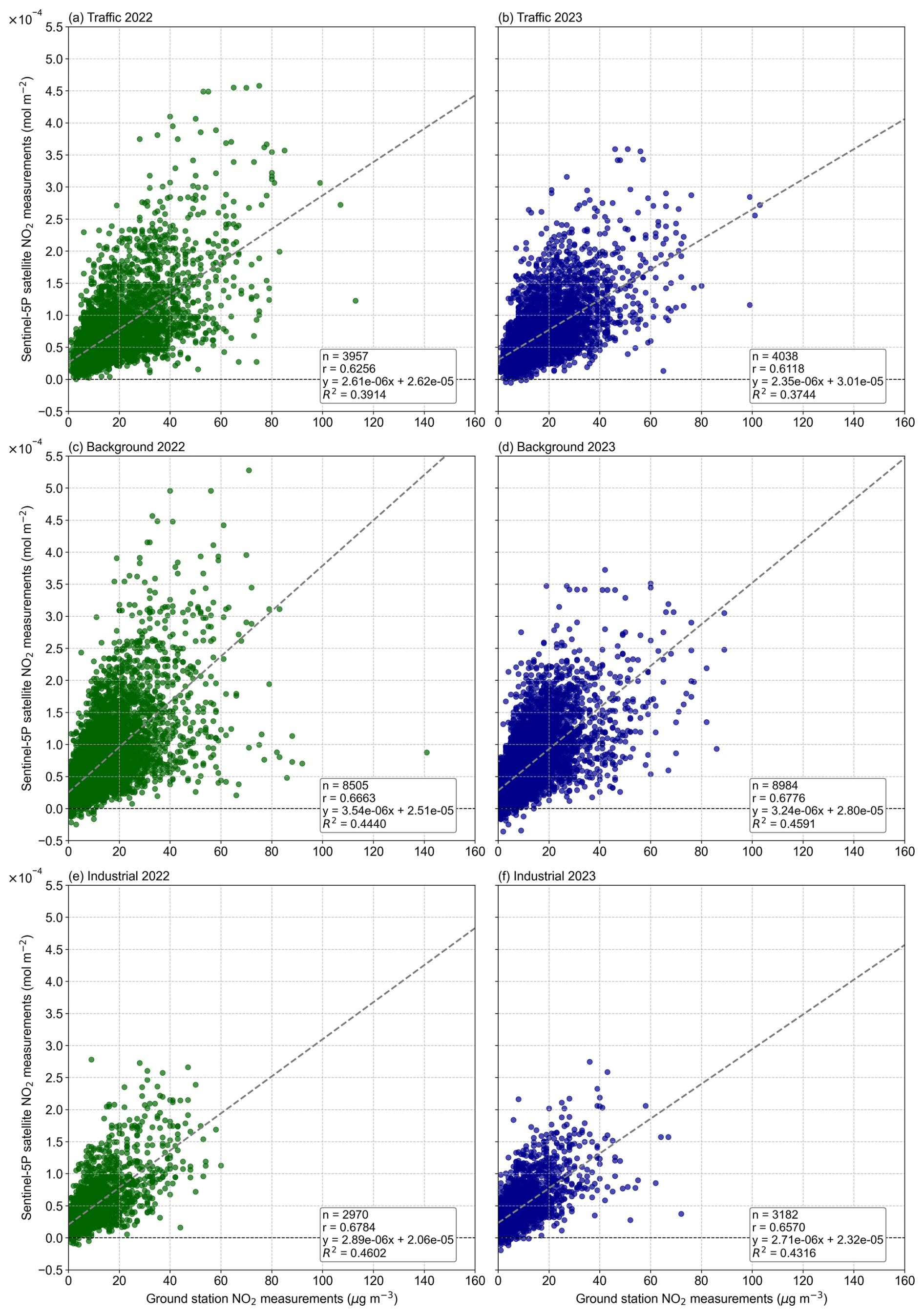Hereafter, we present the correlation analysis based on different station typologies: traffic, background, and industrial stations. This analysis allows us to assess how NO2 concentrations align with satellite data, depending on the type of activity in the vicinity of the stations. The results for 2022 and 2023 are illustrated in Fig. 7, which displays scatter plots and regression lines for each typology. The corresponding statistical values are summarized in Table 5.