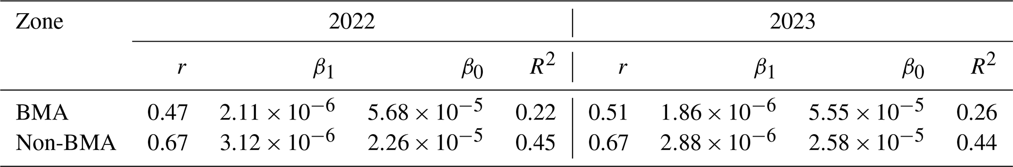 Table 4Pearson correlation coefficient (r), slope (β1), intercept (β0), and coefficient of determination (R2) for NO2 levels in BMA and non-BMA zones during 2022–2023. Calculations are based on daily satellite data matched with surface NO2 measurements recorded at 13:00 UTC.