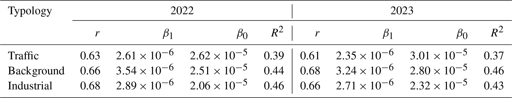 For traffic stations, the correlation values were moderate, at 0.63 in 2022 and 0.61 in 2023. Background stations showed slightly higher correlations, with values of 0.66 in 2022 and 0.68 in 2023. Similarly, industrial stations demonstrated correlations of 0.68 in 2022 and 0.66 in 2023.