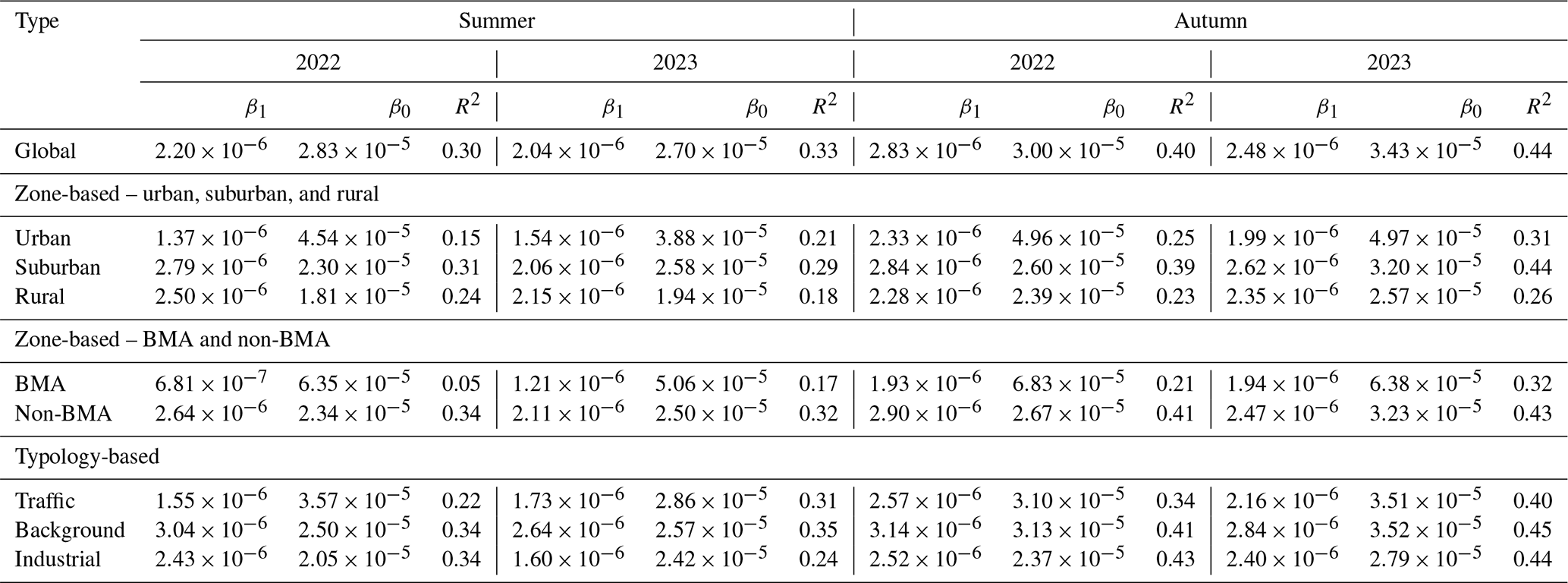 Finally, we present in Table 6 a seasonal analysis that covers all recorded values from 2022 and 2023 and provides a detailed view of how seasonal factors – such as temperature and atmospheric conditions – affect both the r correlation and the coefficient of variation (CV) between satellite and surface measurements of NO2 throughout the year. Additionally, Tables 7 and 8 summarize the regression analysis results, including β1, β0, and R2 for NO2 measurements across different seasons and typologies, highlighting the seasonal variability observed in the data.