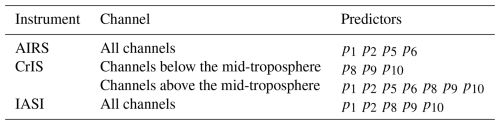Table 2Predictors used in bias correction of different infrared hyperspectral instruments for ECMWF. The px in the table correspond to Table 1.