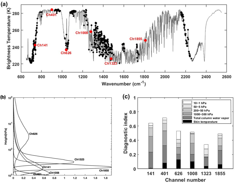 Figure 1(a) Simulated HIRAS-II brightness temperature spectrum (black curve) by the RTTOV using the US76 standard atmospheric profile, the selected 6 typical channels (red dots) and the assimilated 485 channels (black dots). (b) weighting function of the selected channels. (c) relevance diagnostics of bias-correction.