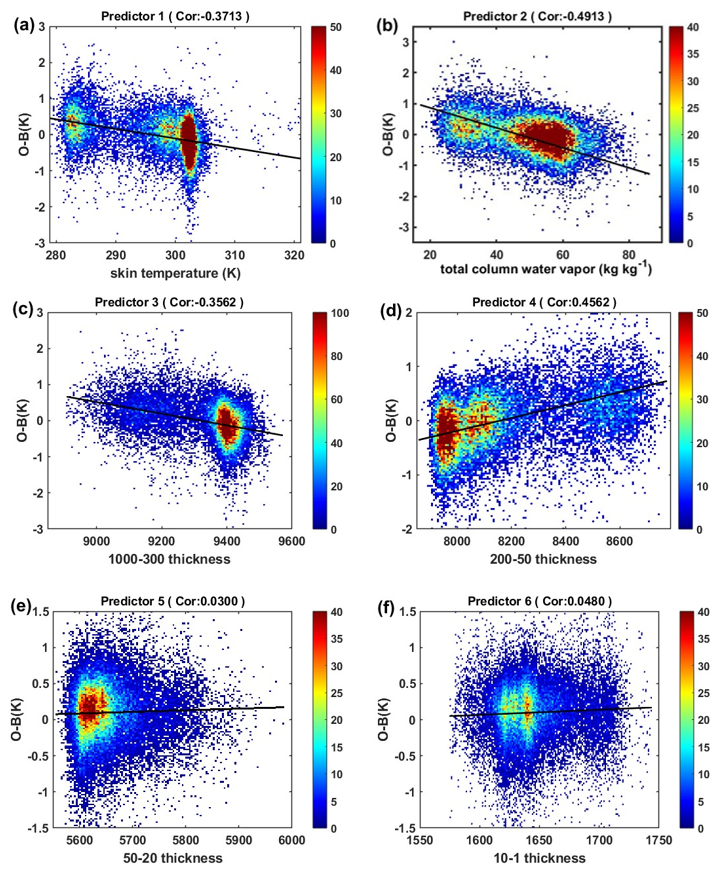 As we discussed earlier, model surface skin temperature, model total column water vapor, thickness of 1000–300 hPa and thickness of 200–50 hPa are selected as predictors for bias correction. The multiple linear regression model requires a linear relationship between continuous independent variables and dependent variables. Therefore, we examine the correlation between HIRAS-II O−B bias and predictors p1–p6 based on samples from 1 to 31 January 2023. Figure 2a–f show the distribution of a typical HIRAS-II channel 1855 (1809.375 cm−1, the peak height of weight function is 500 hPa) O−B bias with predictors p1–p6, respectively. In order to obtain a correct analysis of the relationship between the O−B bias and predictors p1–p6, the O−B biases eliminate the influence of scan bias. The horizontal coordinate of each subgraph is the value of each predictor, the vertical coordinate is the O−B bias and the color represents the number of samples. The black solid line in figure shows the first-order polynomial fit of the O−B bias and predictors, the correlation coefficients are given in the subtitles of each figure. From Fig. 2a–f, there is a certain linear correlation between the O−B bias and predictors p1–p4, with the highest correlation coefficient of 0.49, and there is no obvious linear relationship between the predictors p5–p6.