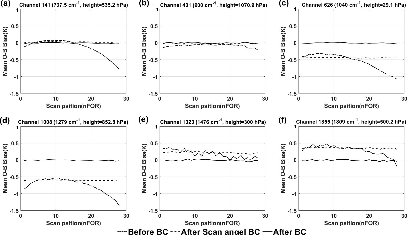 Figure 3The mean O−B bias of HIRAS- II varies with the scan position before and after the bias correction. The subplots are channel (a) No. 141, (b) 401, (c) 626, (d) 1008, (e) 1323 and (f) 1855 in turn. (The dot-dashed line represents the O−B bias before bias correction, while the dotted line and the solid line are the results after the scan-angle and air-mass correction, respectively.)