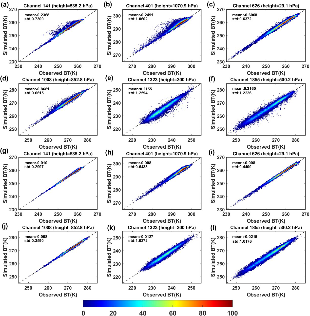 Figure 4The scatterplots of observed versus RTTOV simulated brightness temperature (a–f) before and (g–l) after air-mass bias correction for HIRAS-II channel No. 141, 401, 626, 1008, 1323 and 1855. Color shade is the data number.