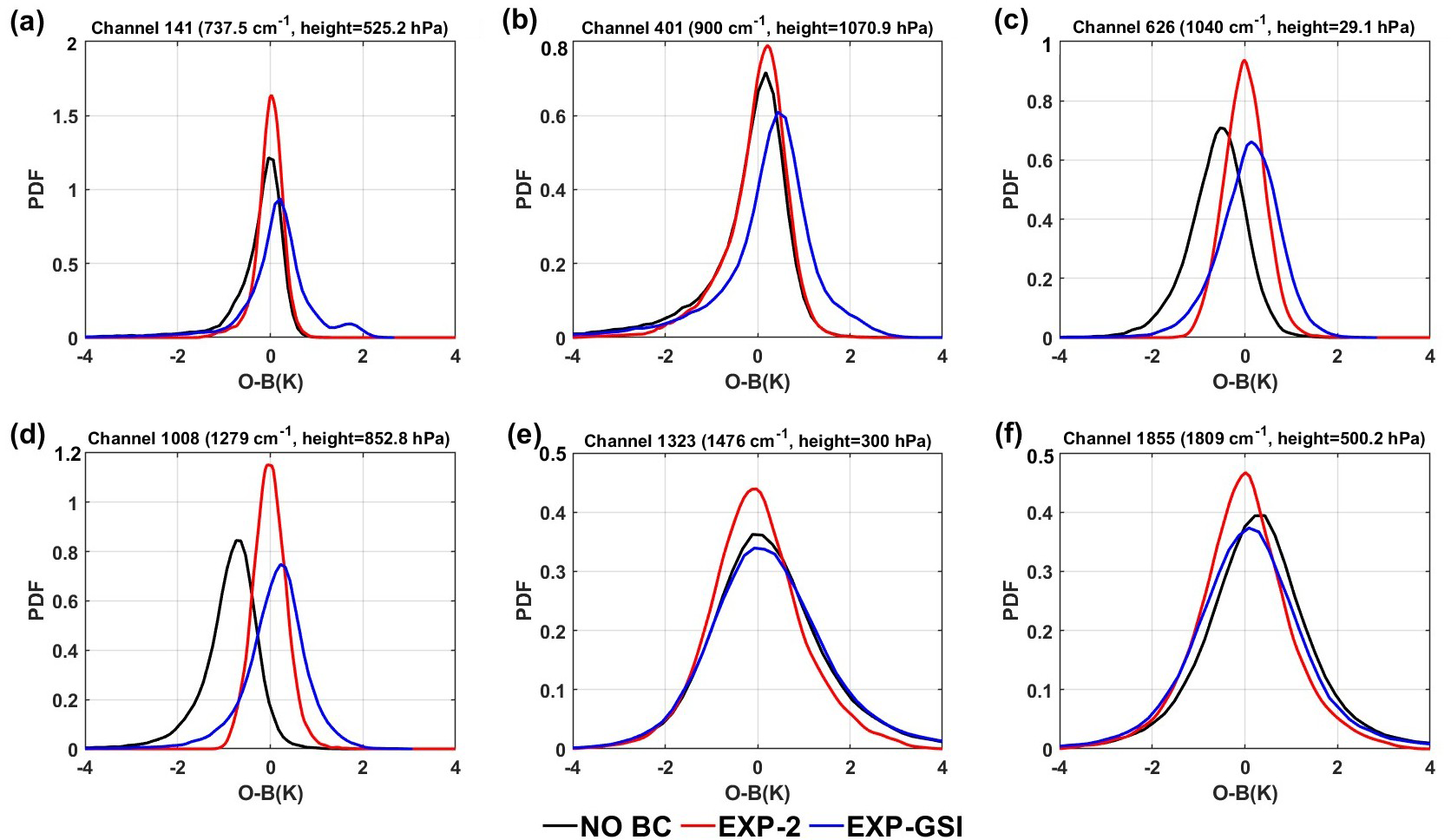 Figure 5The probability density function of O−B bias before (the black curves) and after bias correction for HIRAS-2 channel (a) No. 141, (b) 401, (c) 626, (d) 1008, (e) 1323 and (f) 1855. (the red curves for EXP-2 BC and blue curves for EXP-GSI).