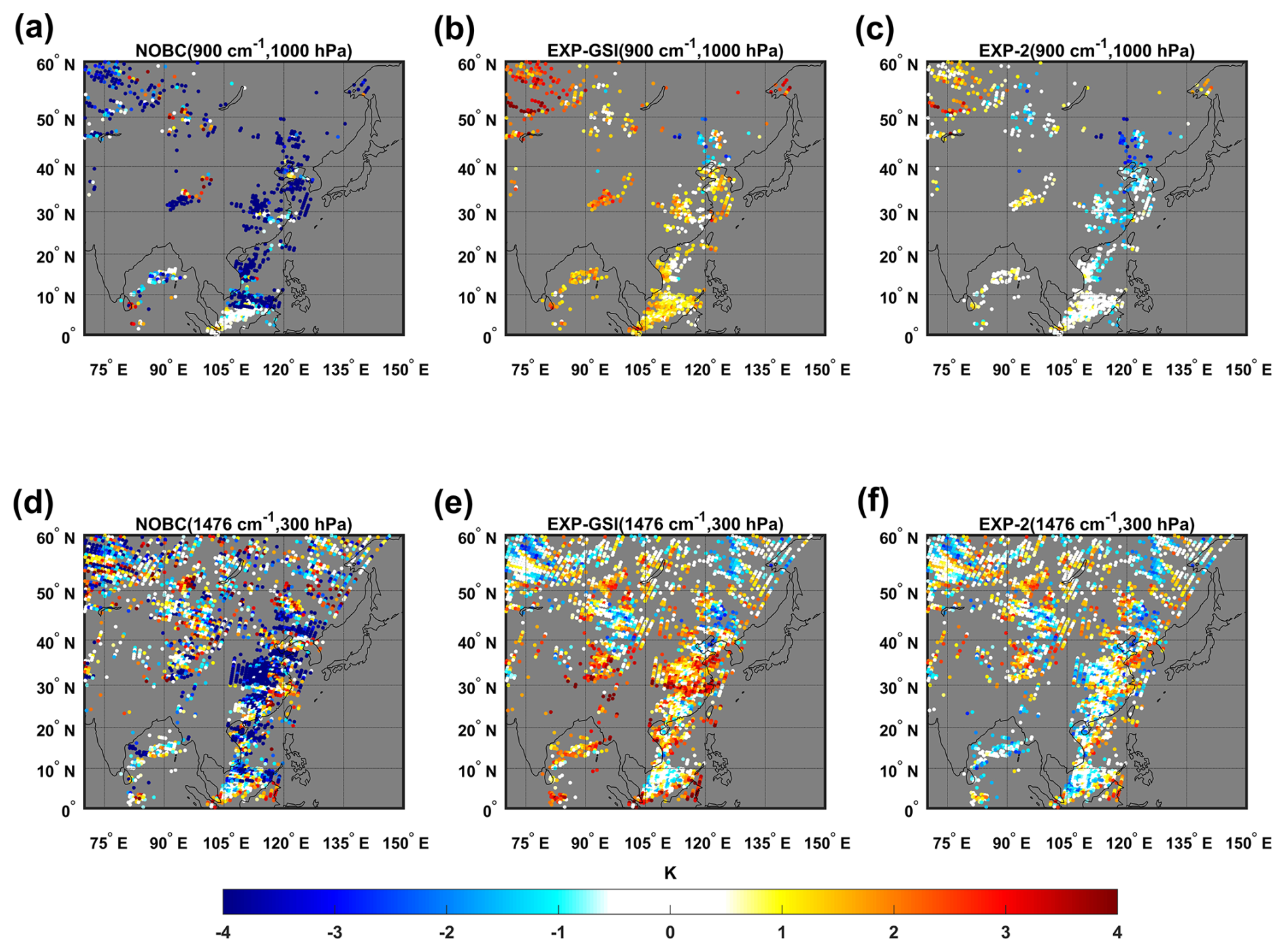 In order to specifically analyze the improvement of the analysis by different schemes, three data assimilation experiments at 00:00 UTC 7 August 2023 were selected for analysis. Figure 7 shows the spatial distribution of HIRAS-II O−B biases. The colored dots in figures represent the values of the O−B bias, with colder colors being negative bias and warmer colors being positive bias. The shading indicates the observed FY-4A AGRI brightness temperature of the window channel 13 at a central wavelength of 12 µm. Figure 7a–c show the distribution of O−B biases passed QC in 900 cm−1 channel (1000 hPa) for the NOBC, EXP-GSI and EXP-2, respectively. Figure 7d–f are as above but for 1476 cm−1 channel (300 hPa). It can be seen that the O−B biases without BC have either cold or warm bias (Fig. 7a and d). The most O−B biases after EXP-GSI BC are slightly warmer (Fig. 7b and e), especially in the region from 0 to 30° N. The overall O−B biases after EXP-2 BC is near 0 (Fig. 7c and f) and the correction effect is significant.