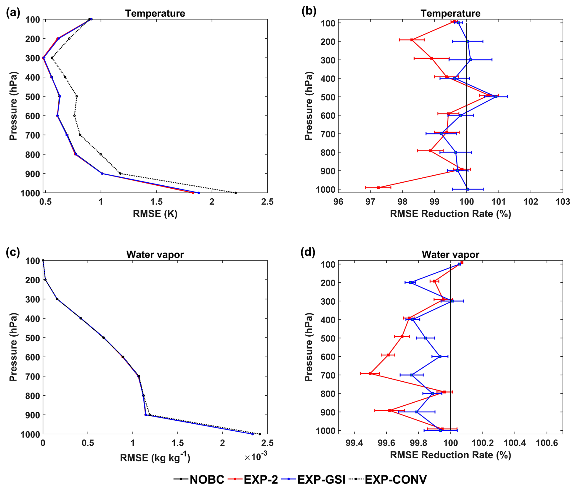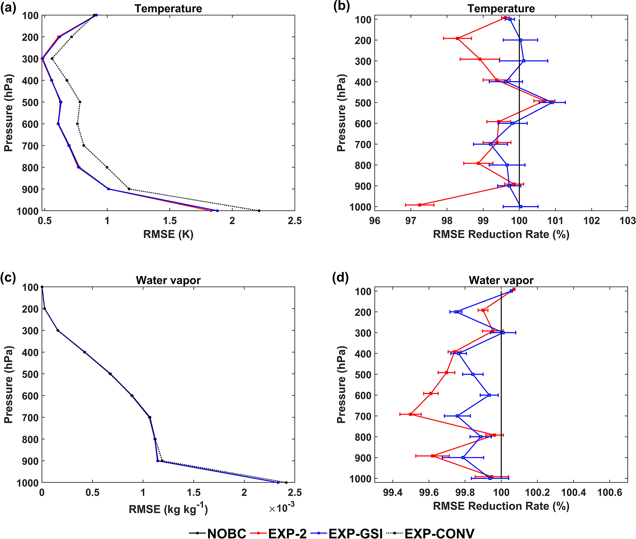 Figure 8Averaged vertical RMSE profiles of (a) temperature and (c) water vapor compared with ERA5. The vertical RMSE profiles of (b) temperature and (d) water vapor are normalized by the RMSE from the NOBC experiment. Error bars give statistical significance intervals for differences from the NOBC at the 95 % level.