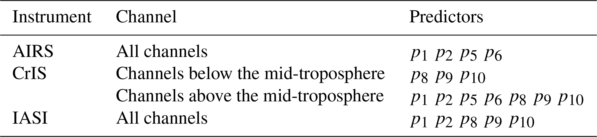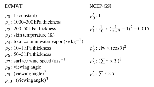 Table 2Predictors used in bias correction of different infrared hyperspectral instruments for ECMWF. The px in the table correspond to Table 1.