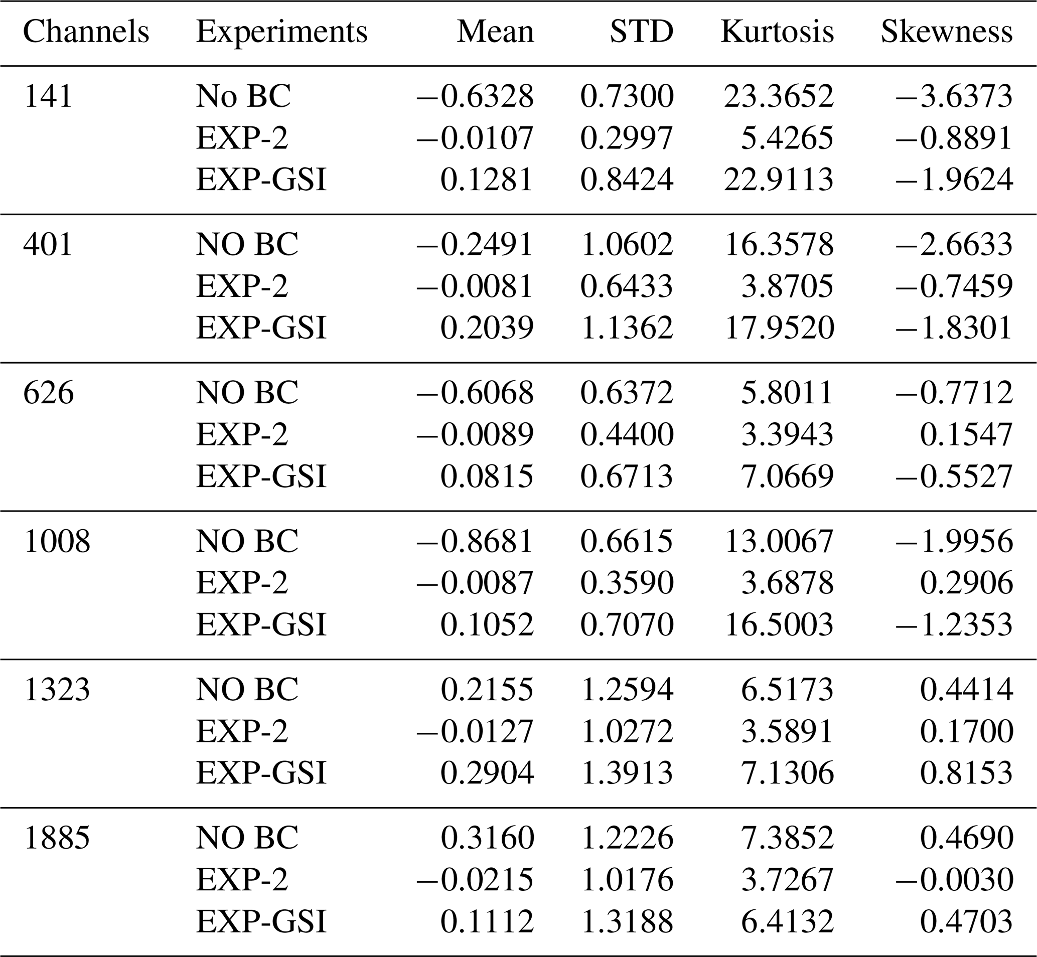 In order to examine whether the distribution of O−B biases after correction satisfies a normal distribution with a mean of 0, Table 4 presents the values before and after correction for these two schemes. Mean represents the mean value, STD represents the standard deviation, Kurtosis value indicates the steepness of the sample distribution and Skewness is the asymmetry of the sample distribution. Kurtosis of 3 and skewness of 0 indicate a normal distribution. It can be seen that the kurtosis and skewness values in all channels after EXP-GSI correction have not changed significantly, while both the observation residuals and standard deviations in all channels show a significant reduction after correction by EXP-2. The O−B bias of all other channels expect for channel 141 with higher kurtosis 5.4 are close to a normal distribution with kurtosis value 3 and skewness value 0. This indicates a significant improvement in the correction effect for EXP-2.