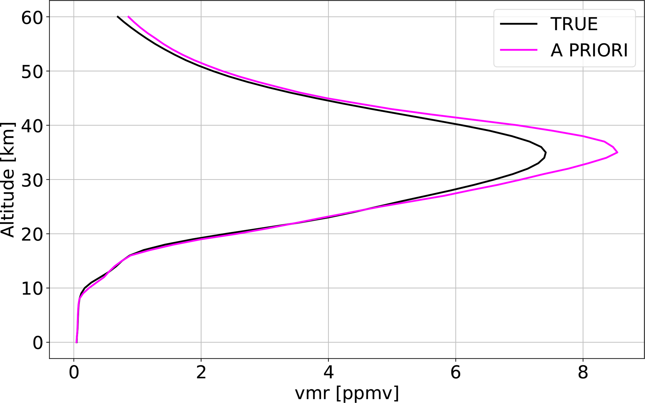 Figure 2Ozone profile for the selected ERS scenario (TRUE; daytime, latitude 45° N, April) and a priori profile from McPeters and Labow climatology.