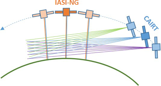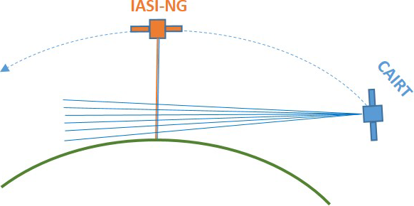 In order to be able to combine CAIRT and IASI-NG measurements and to exploit the synergy, CAIRT, if selected, will fly in loose formation with MetOp-SG satellite, bringing on board IASI-NG together with several other instruments looking at nadir. The two satellites will fly on the same orbit, dephased of about 27° to match IASI-NG FOV with the region of the lines of sight of CAIRT closer to the surface. This will allow to exploit the complementary information of the two instruments, with CAIRT providing an unprecedented 3D view of the atmosphere from 4–5 to 115 km, with high vertical and horizontal (both along and across track) resolution, and IASI-NG providing even better spatial resolution along and across track, allowing the extension of CAIRT measurements down to the surface.