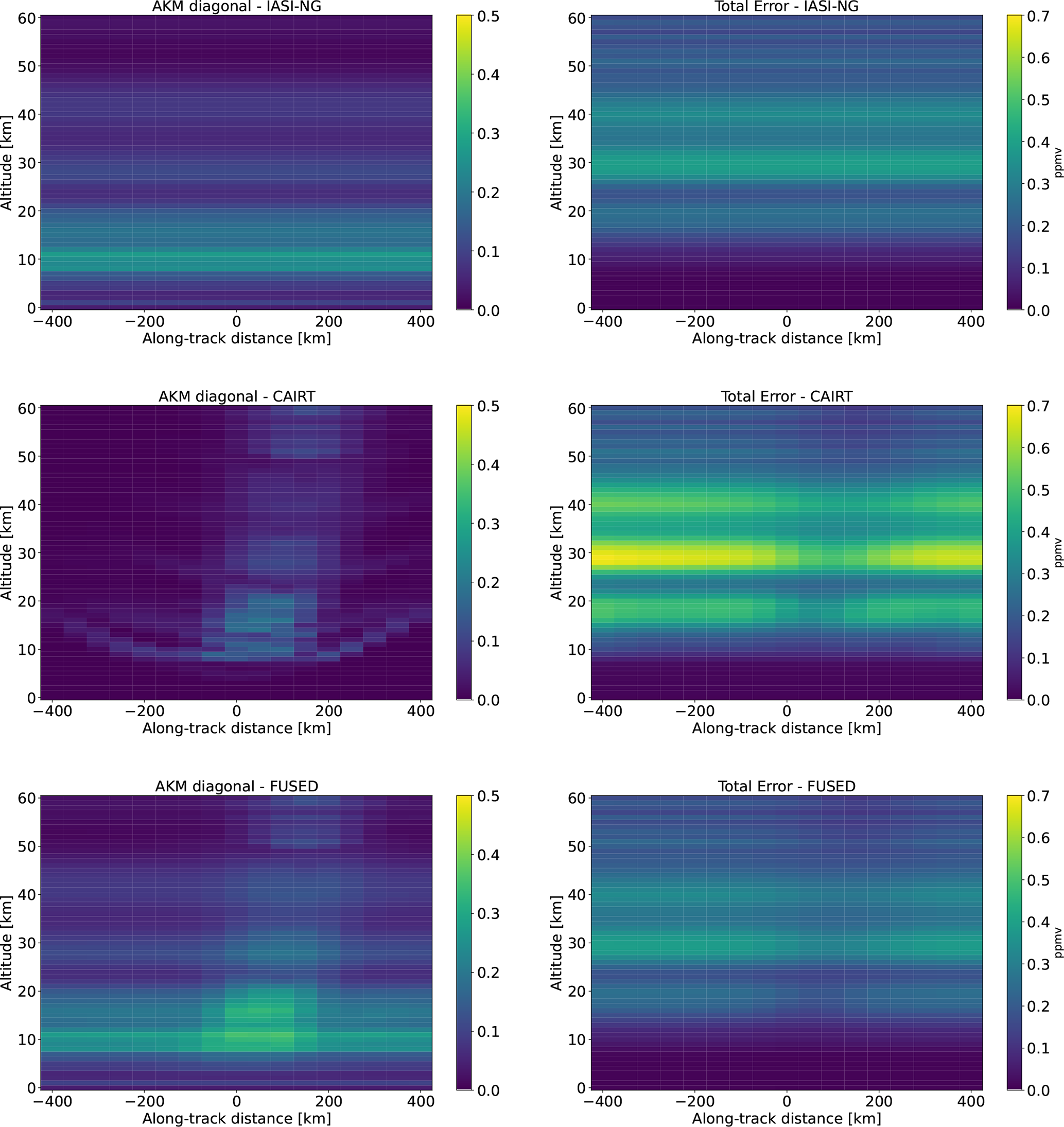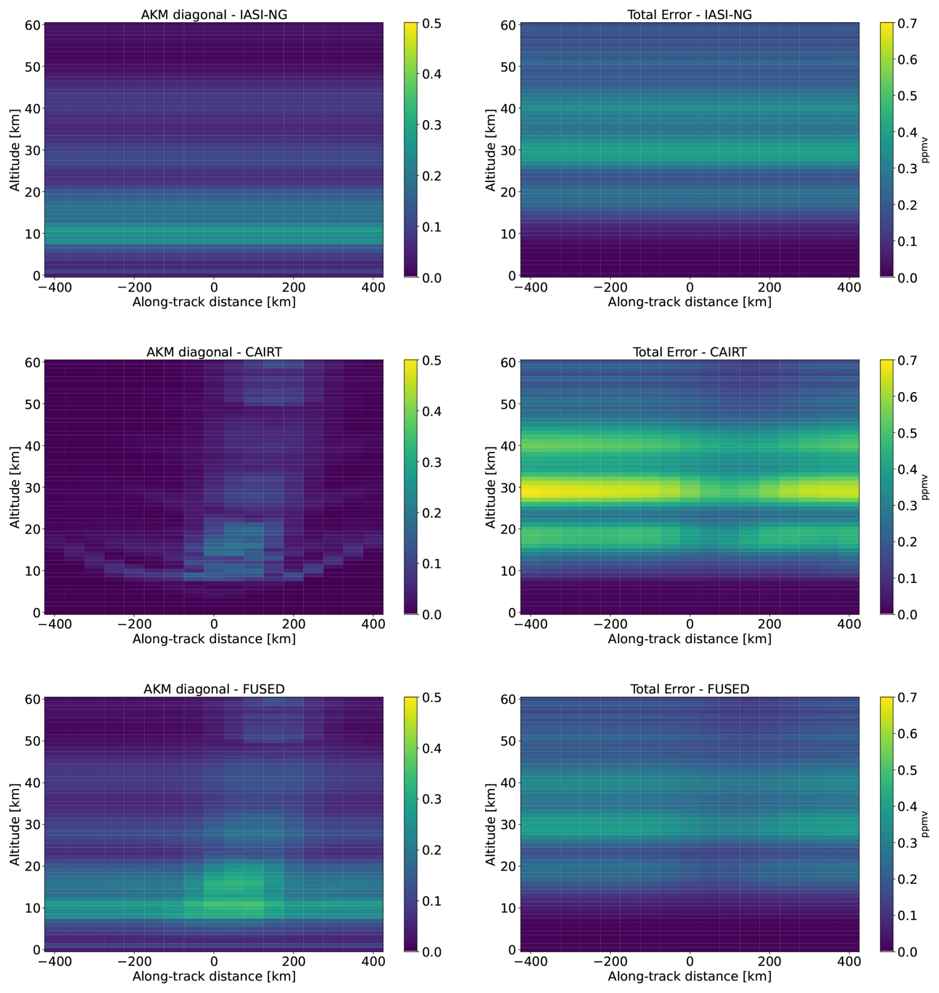 The results obtained for the profiles corresponding to the central ATK position are shown in Fig. 7. The profile of the AKM diagonal elements of the fused product shows values greater than 0.25 between 8 and 20 km (with a peak of 0.35 at 10 km), demonstrating greater vertical sensitivity with respect to the individual products. CAIRT and IASI-NG have the same behavior and nearly the same values between 15 and 50 km, although IASI-NG shows higher values from 0 to 15 km (with a maximum value of 0.27 near 10 km) and CAIRT above 50 km, closer to those of the fused product profile. The total error of the synergistic product is the smallest, with a maximum value of 0.3 ppmv at 30 km. In the vertical range between 8 and 50 km, the total errors of the fused product profile are up to 0.1 and 0.2 ppmv smaller than those of IASI-NG and CAIRT, respectively. The individual products are very close to the synergistic one in the remaining part of the vertical range (CAIRT in the upper part and IASI-NG near the surface).