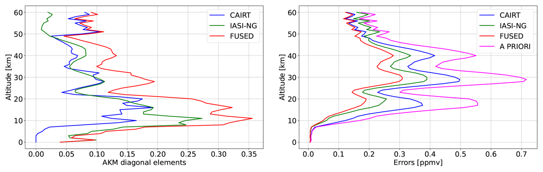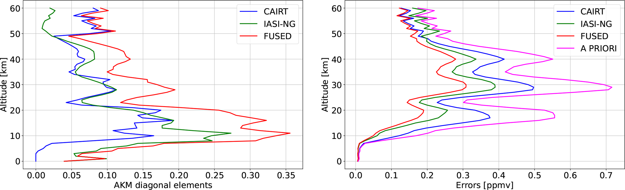 Near the surface, the fused product has the same values of the IASI-NG product, as expected by the fact that CAIRT does not perform measurements below 5 km. The highest level of vertical sensitivity is shown in the region between 8 and 20 km, where the values of the AKM elements vary from 0.4 to 0.75, reaching a peak at 15 km. The total error profile of the fused product is overlapped to that of CAIRT and more than 50 % smaller than that of IASI-NG from roughly 8 up to 60 km. Below 8 km the fused product displays the highest quality, with respect to the individual products. The a priori error profile is also reported in the plot: it shows some oscillations (larger errors are found in correspondence of altitudes where the profile has a large slope) that are transferred in the total error profile of both the single products and the synergistic one.