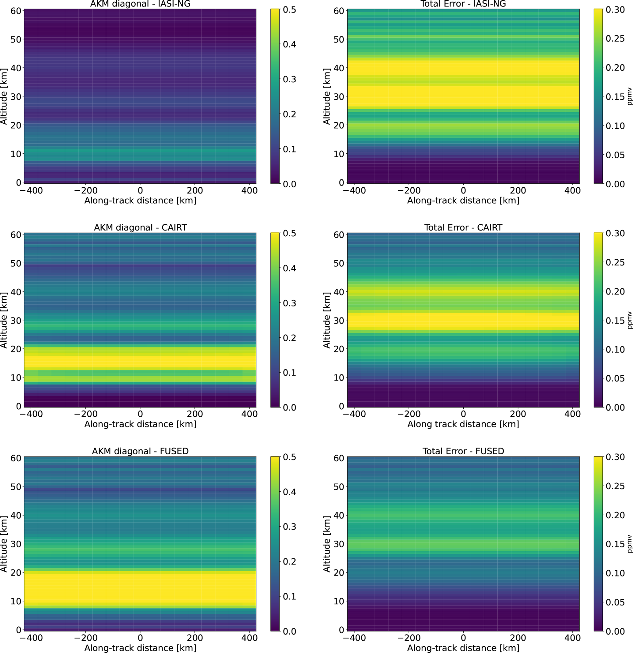 Figure 6Case 2. Diagonal elements of the AKMs (left column) and total errors (right column) in the CAIRT 2D retrieval grid for (from the top) IASI-NG, CAIRT, and the fused product.