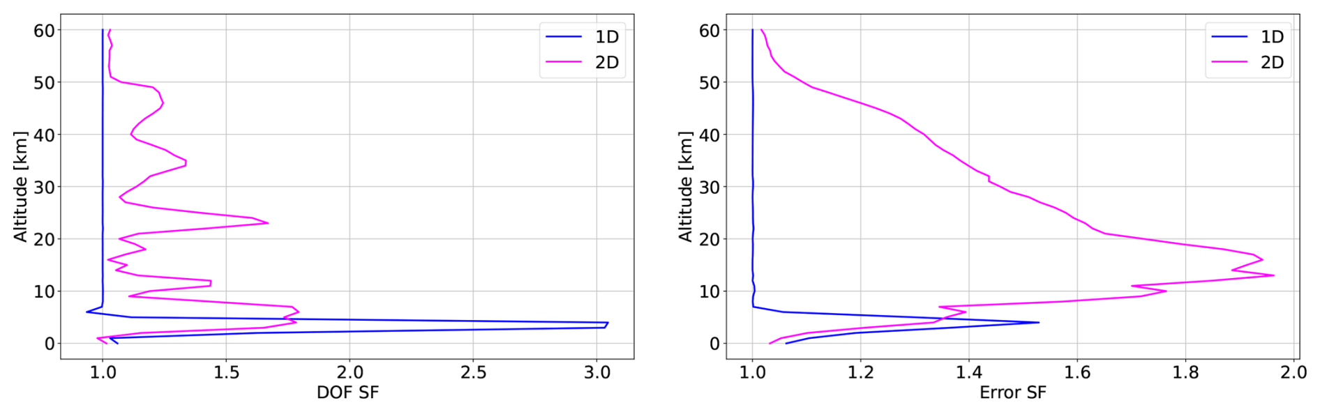 As described in Sect. 5, the performances of the synergy can be evaluated in terms of the synergy factors 𝖲𝖥DOF and 𝖲𝖥err. Figure 11 shows the results for the two SFs, comparing the SF profiles for the 1D and 2D (Case 3) data fusion studies. For 1D analysis, it is possible to take advantage of the synergy only below 8 km (𝖲𝖥err and 𝖲𝖥DOF greater than 1), in the remaining altitude range only the complementarity between the two measurements can be exploited (𝖲𝖥err and 𝖲𝖥DOF equal to 1). For the tomographic analysis, the synergy is fully exploited over the whole altitude range. The error SF once again demonstrates that the highest improvement from the synergy is obtained in the altitude range from 10 to 20 km.