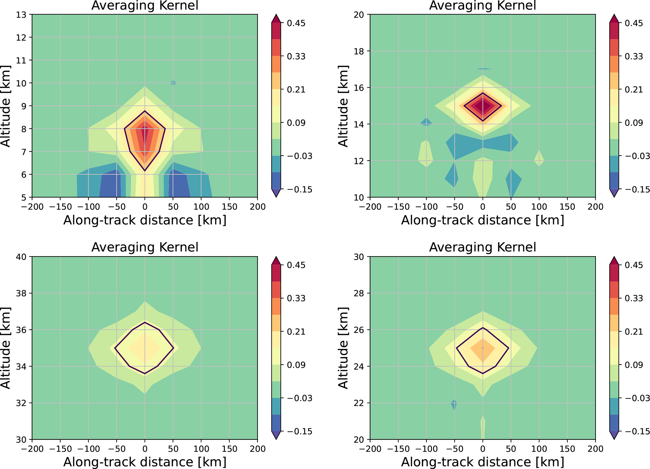 Figure 12Maps of the 2D AKM rows that correspond to the sensitivity of the retrieved vector to the true state at the central along track position and different altitudes: 8, 15, 25, and 35 km from top left clockwise. Results are shown for the fused product.