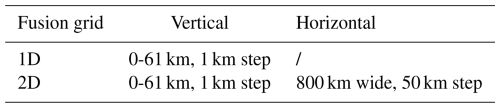In the test cases of this study, we considered: a vertical grid with 61 altitude steps at 1 km intervals for the 1D data fusion, and a 2D grid with a width of 800 km, height of 61 km, horizontal step of 50 km, and vertical step of 1 km for the tomographic data fusion (see Table 1). These choices were made according to the expected horizontal and vertical resolution of CAIRT.