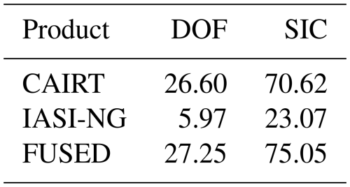 Table 2 shows the values obtained for the number of DOFs and SIC for CAIRT, IASI-NG and the fused product. The fused product shows higher values of the two quality quantifiers with respect to the individual products, in particular with respect to IASI-NG (a gain of 3 times for the SIC and 4.5 times for the number of DOF), as expected.
