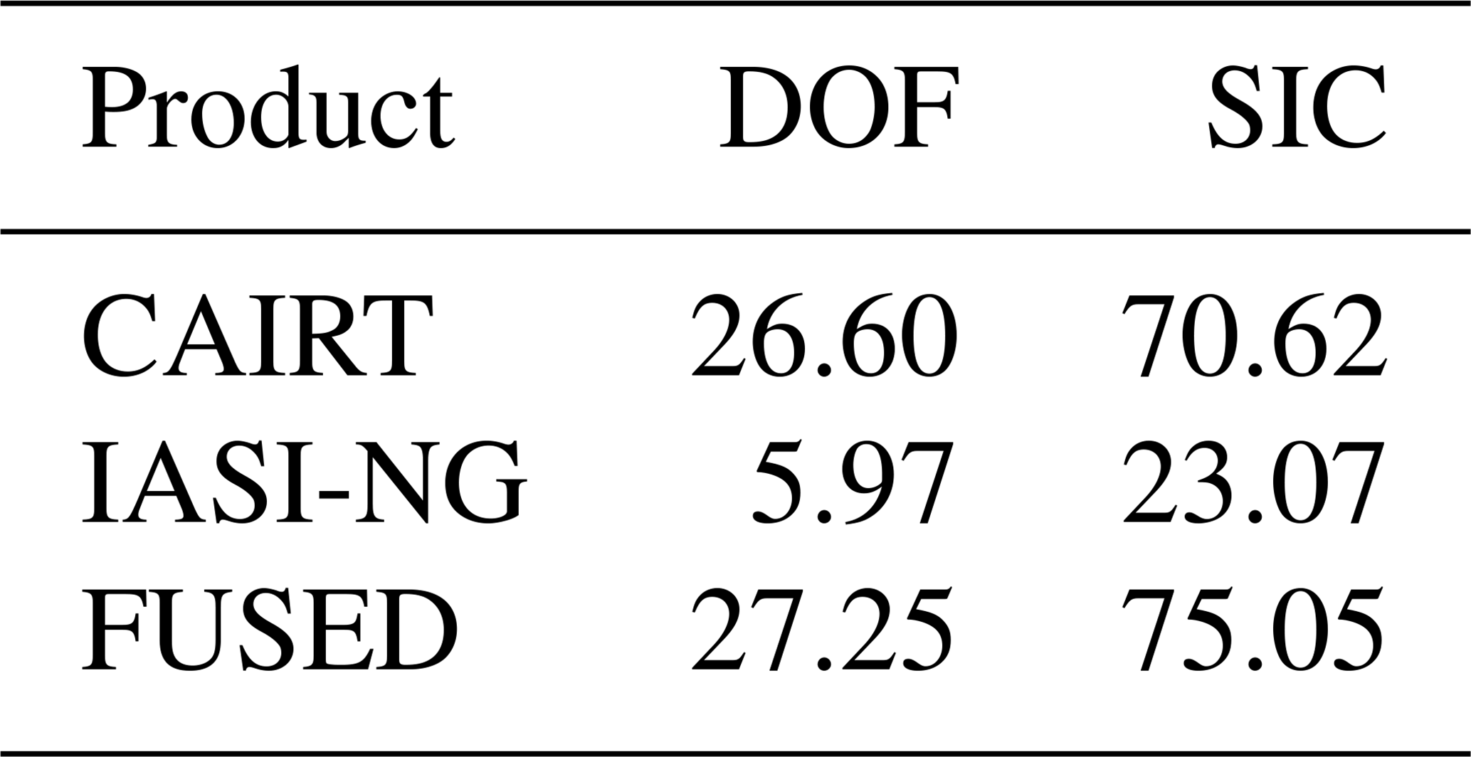 The values of the number of DOFs and SIC for Case 3 are summarized in Table 4. The fused product shows the highest number of DOFs and SIC values compared to the individual products. In this case, the 51 measurements of CAIRT cover the whole 2D space and demonstrate the highest contribution to the fused product. For IASI-NG, DOFs and SIC values are exactly the same of Case 2, as expected.