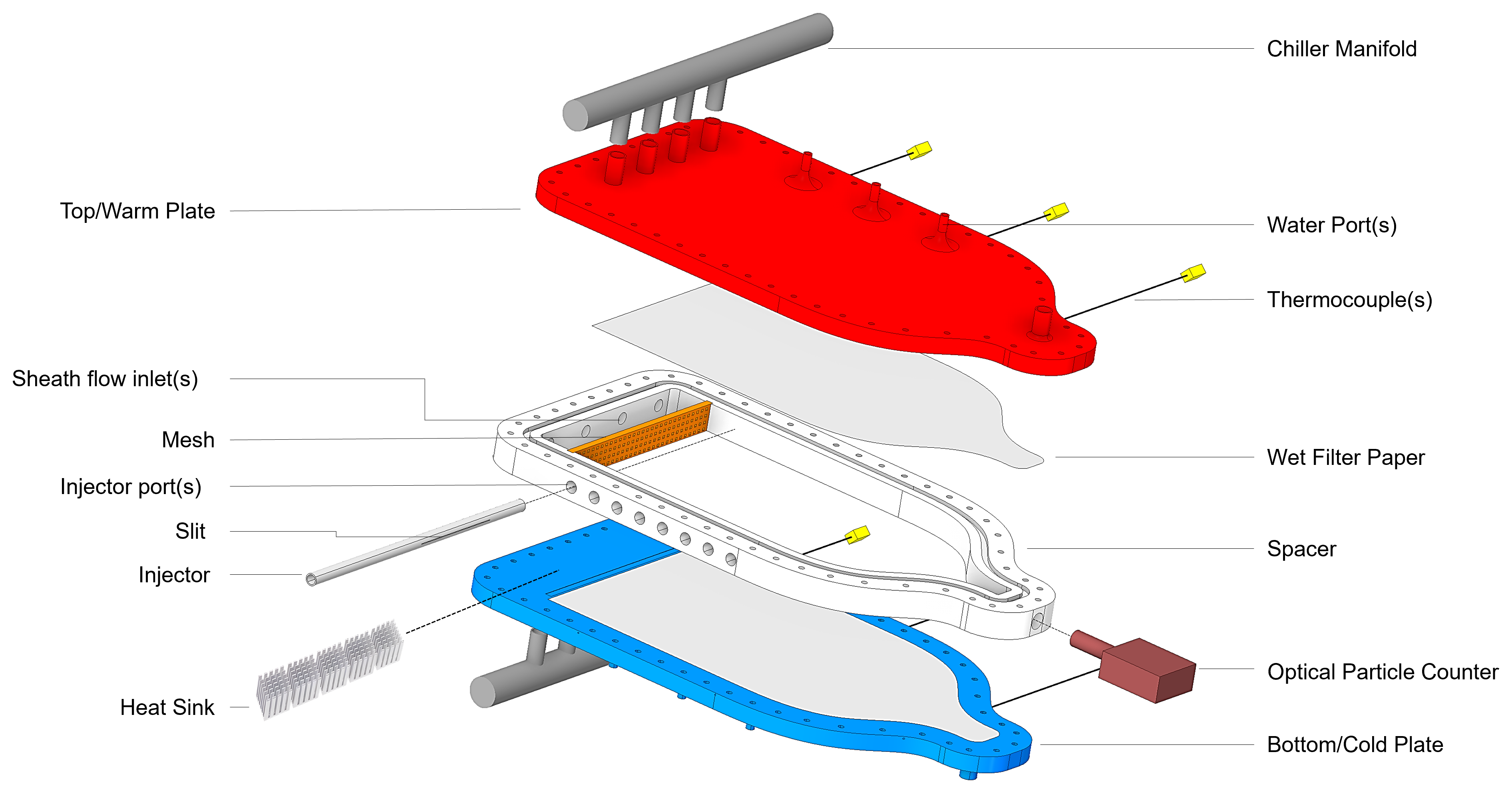 Figure 1Exploded view of the Horizontal Cloud Condensation Nuclei Counter (HCCNC), showing the entire chamber excluding the re-circulating chillers.