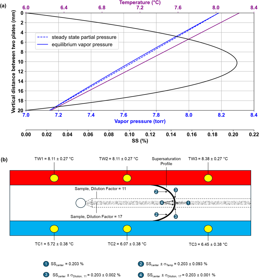 Figure 2Supersaturation (SS) profile between the two parallel plates in the HCCNC (a). Example with cold wall at 6.3 °C (average of TC2 = 6.07 and TC3 = 7.41 °C) and warm wall at 8.2 °C (average of TW2 = 8.11 and TW3 = 8.38 °C), shown by the purple line. The solid blue line represents equilibrium water vapour pressure, while the dotted blue line shows the steady-state partial pressure across the chamber. The black curve indicates the water SS profile. Schematic illustrating a side view of the HCCNC including uncertainty values of SS due to aerosol width and temperature measurements (b). The black curve represents the SS profile between the two plates, as shown in panel (a). The sample flow from the injector, with a dilution factor of 17, is shown as the shaded grey region. The dotted line indicates the increased sample width when the dilution factor is reduced to 11. TW and TC denote thermocouples installed on the warm and cold wall, respectively. Position (4) denotes the SS uncertainty of the central lamina, resulting from a temperature uncertainty of ±0.47 °C. Corresponding uncertainties at lower SS are plotted in Fig. 4c.