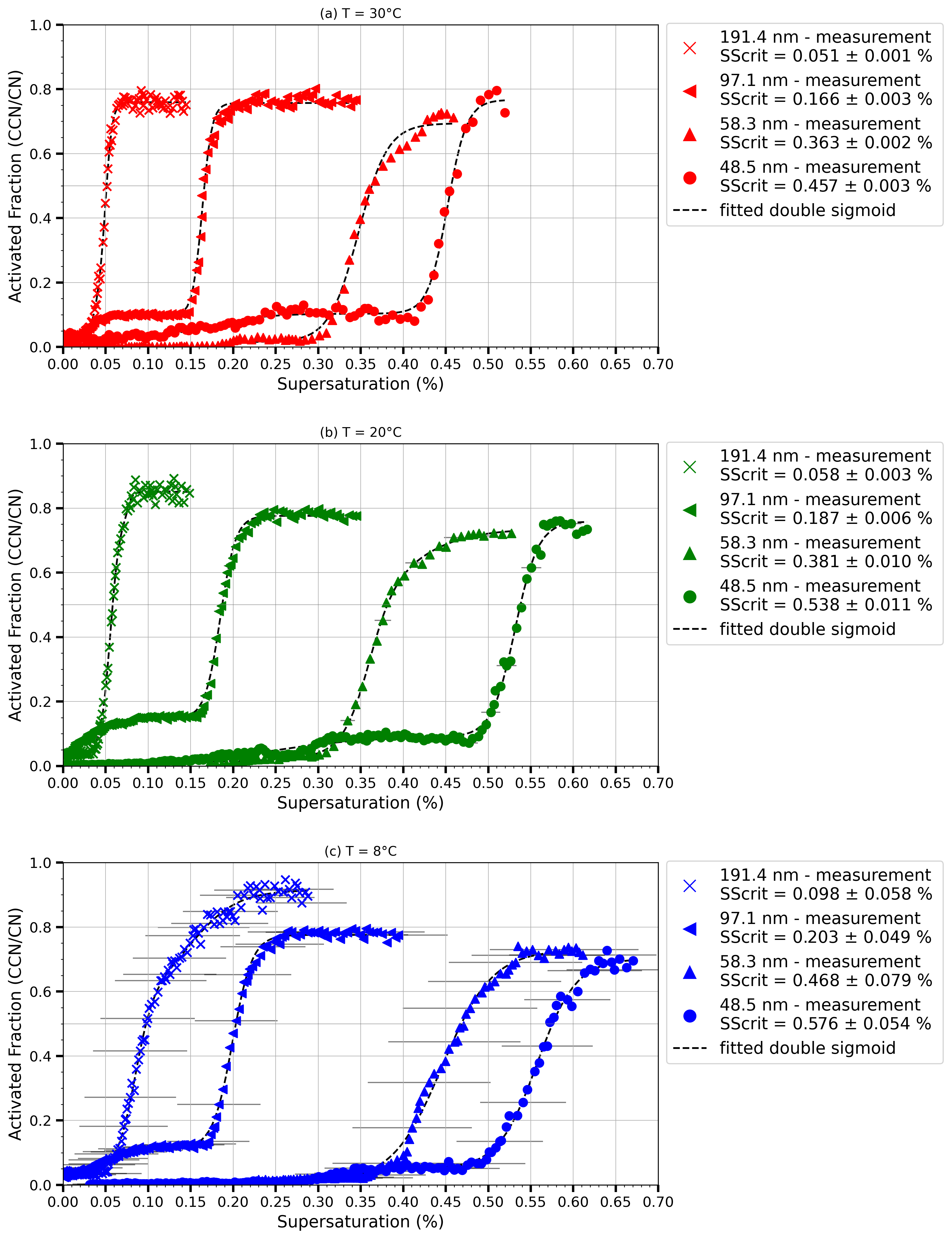 Figure 4The activated fraction (AF) plotted as a function of supersaturation (SS; %) for ammonium sulfate particles with dry diameters of 48.5, 58.3, 97.1 and 191.4 nm. The critical supersaturation ± uncertainty is indicated in the legend for each curve shown, and the dotted curve represents a double sigmoid fitted to the measurements. The different panels show SS scans performed at different temperatures indicated. Horizontal error bars represent the estimated uncertainties in SS, derived from a combination of temperature measurements and aerosol layer thickness. Panels (a) and (b) have very small uncertainties which do not show up in the data but are provided for the SScrit in the legend.