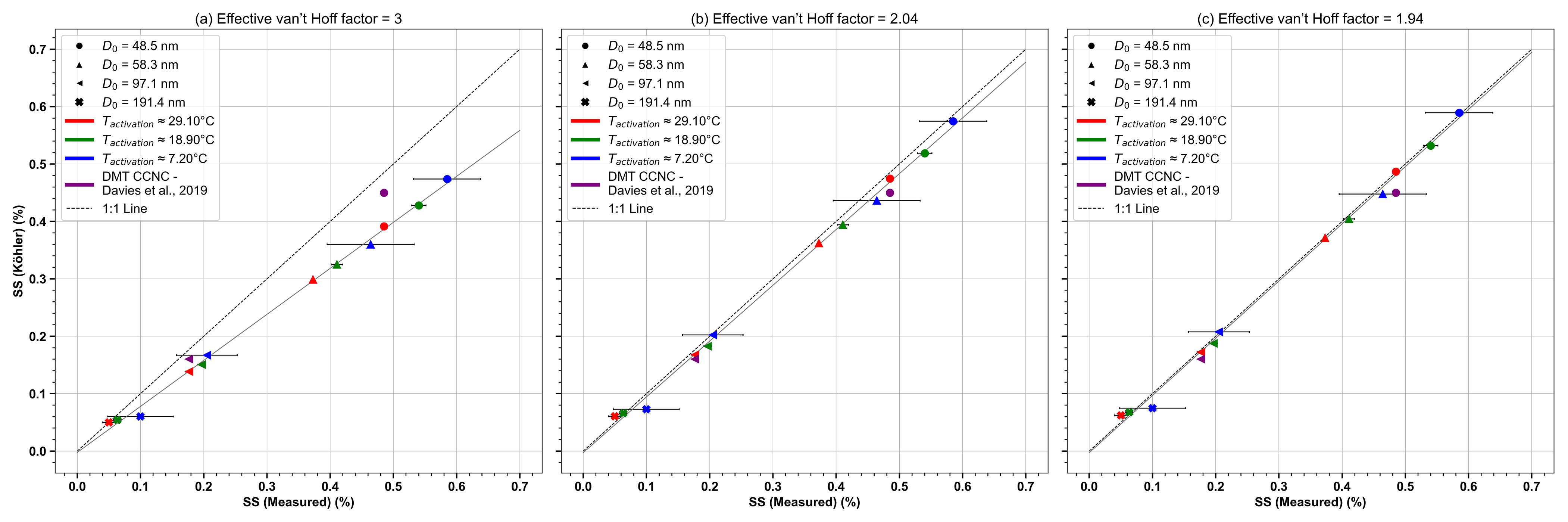 To validate the HCCNC, CCN activation experiments were conducted in the temperature range 30–8 °C to measure the SScrit for size-selected ammonium sulfate particles. To verify accuracy, the SScrit measured was compared to the predicted SScrit calculated with standard Köhler theory and data from Davies et al. (2019). The SS values used for comparison (SSKöhler) were calculated using Eq. (2), as discussed in Pradeep Kumar et al. (2003).