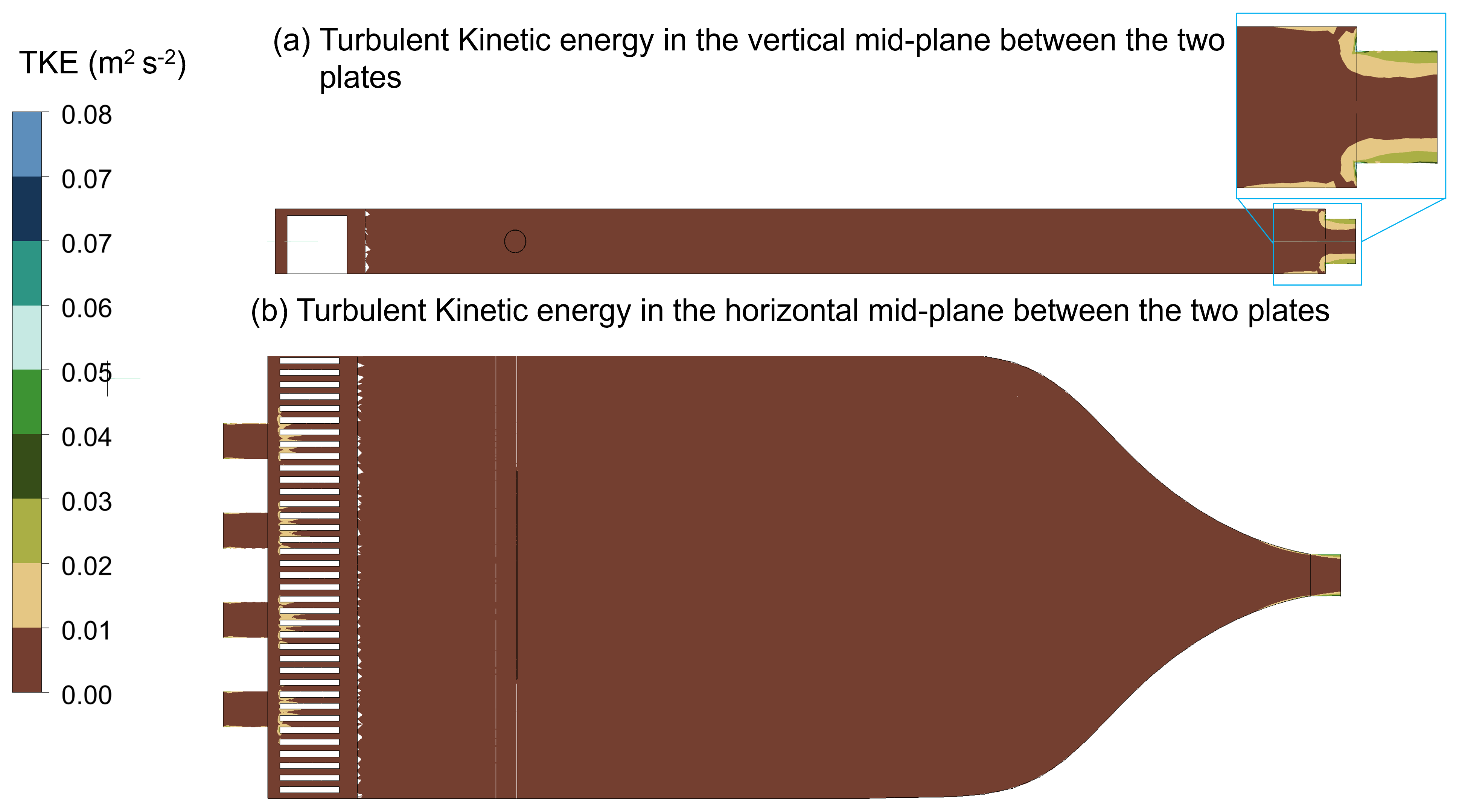 Figure A3Turbulent kinetic energy (TKE) within the HCCNC when the top (warm) plate is at 8 °C and the bottom (cold) plate at 5 °C, while the sheath and sample flows enter the chamber at 20 °C via the spacer and injector, respectively. Panel (a) displays the TKE profile in the vertical mid-plane between the two plates. The sky-blue bordered inset presents a magnified view of a specific sky-blue region from the main figure. Panel (b) shows the TKE profile along the horizontal plane and at middle of the chamber.