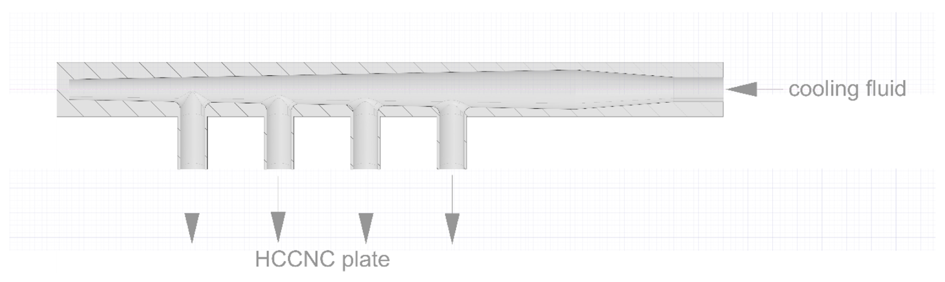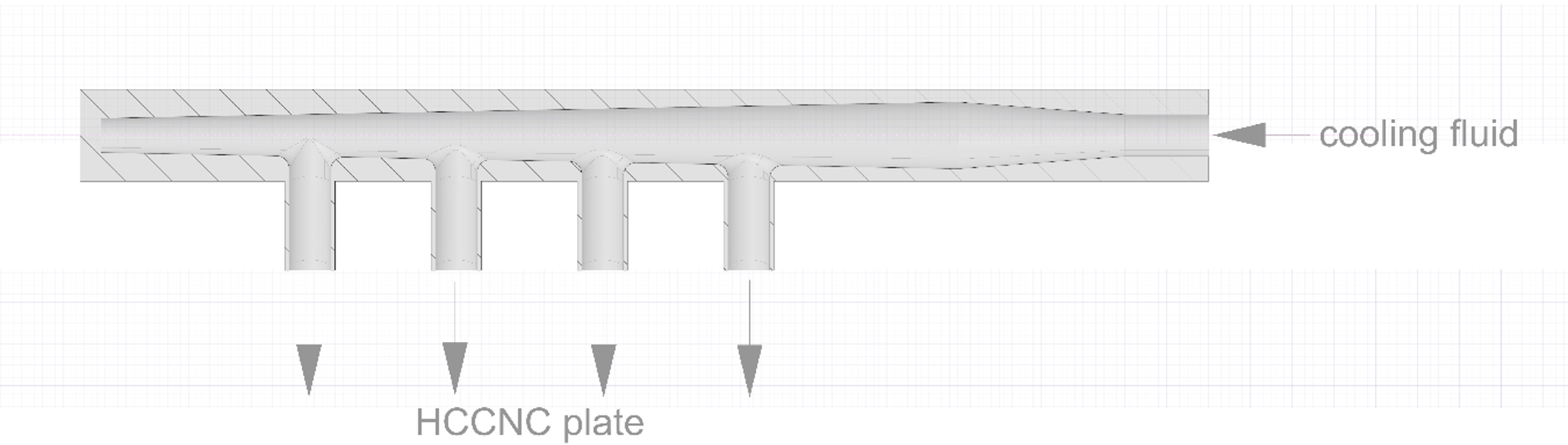 The cooling fluid is supplied to the plates through chillers connected via a chiller manifold (see Fig. 1). As shown in Fig. A4, the internal diameter of the manifold gradually decreases along the streamwise direction. This design compensates for pressure losses caused by friction over the length of the manifold. By reducing the diameter, the cross-sectional area decreases, causing the flow velocity to increase as per the continuity equation (Fox et al., 2020), which helps maintain sufficient pressure to effectively transport the cooling fluid. This ensures an even distribution of cooling fluid across all four inlets of the plates.