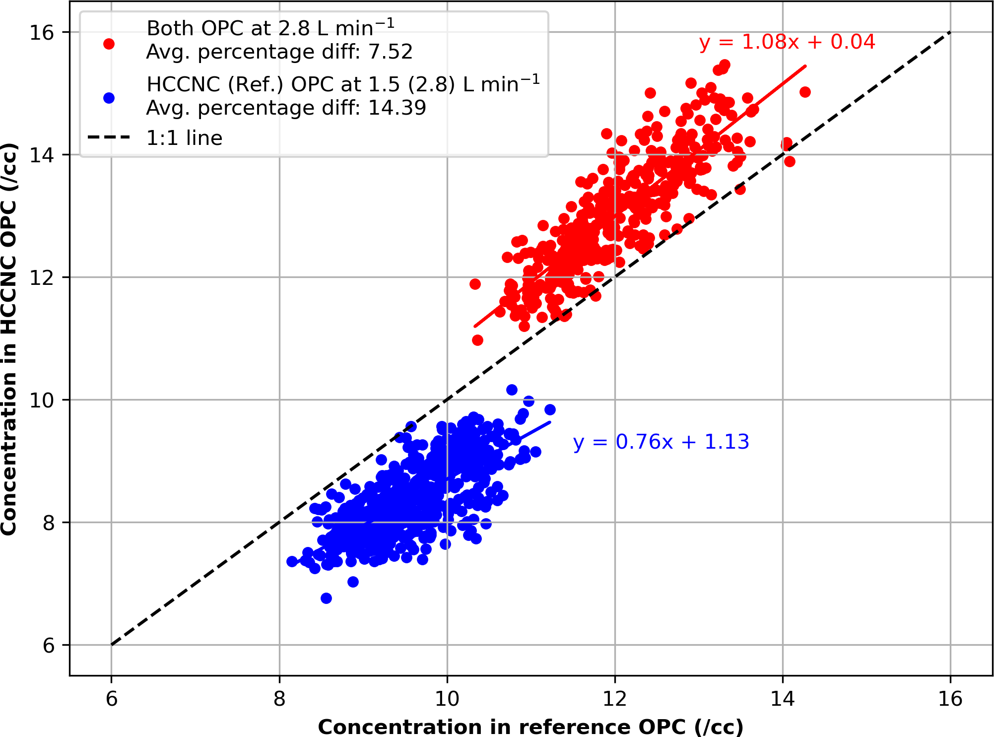 An OPC Model 804 (MetOne Instruments, Inc.) is used to detect droplets at the HCCNC outlet. While the OPC is calibrated for a flow rate of 2.83 L min−1, it was operated at 1.5 L min−1 to ensure adequate residence time for particles in the HCCNC, as the higher flow rate (2.83 L min−1) reduces the time particles are exposed to supersaturation conditions, affecting growth and detection. Intercomparisons between the HCCNC OPC and a reference OPC of the same model operated were conducted using room air. The results (Fig. A5) indicate that the HCCNC OPC measured a  14 % lower particle number concentration at the reduced flow rate (i.e. at 1.5 L min−1, blue data points). When both OPCs were operated at the same flow rate of 2.83 L min−1, the average percentage difference was  8 % (red data points), which falls within the typical manufacturer-reported uncertainty of ±10 %. Consequently, to account for the reduced flow rate, the blue data points require a 15 % adjustment to align with the reference OPC measurements, which was also applied to our measurements (see Sect. 2.6).
