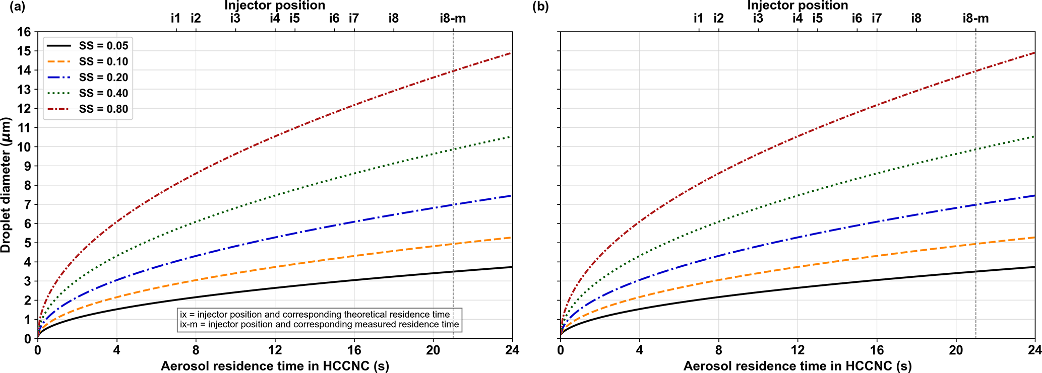 Figure A6Theoretical growth of activated ammonium sulfate particles with dry diameters of (a) 97.1 nm and (b) 191.4 nm, modelled as a function of supersaturation and residence time based on the growth equation from Rogers (1988) at 30 °C. The secondary x axis (i1–8) represents the injector position at the HCCNC, corresponding to the particle residence time on the primary x axis. Theoretical particle residence time is calculated by assuming a centreline particle velocity is 3/2 of the bulk velocity (parabolic velocity profile), with a total chamber flow rate of 1.5 L min−1, as the particle stream flows between two parallel plates; “i8-m” denotes the experimentally measured residence time at injector position 8.