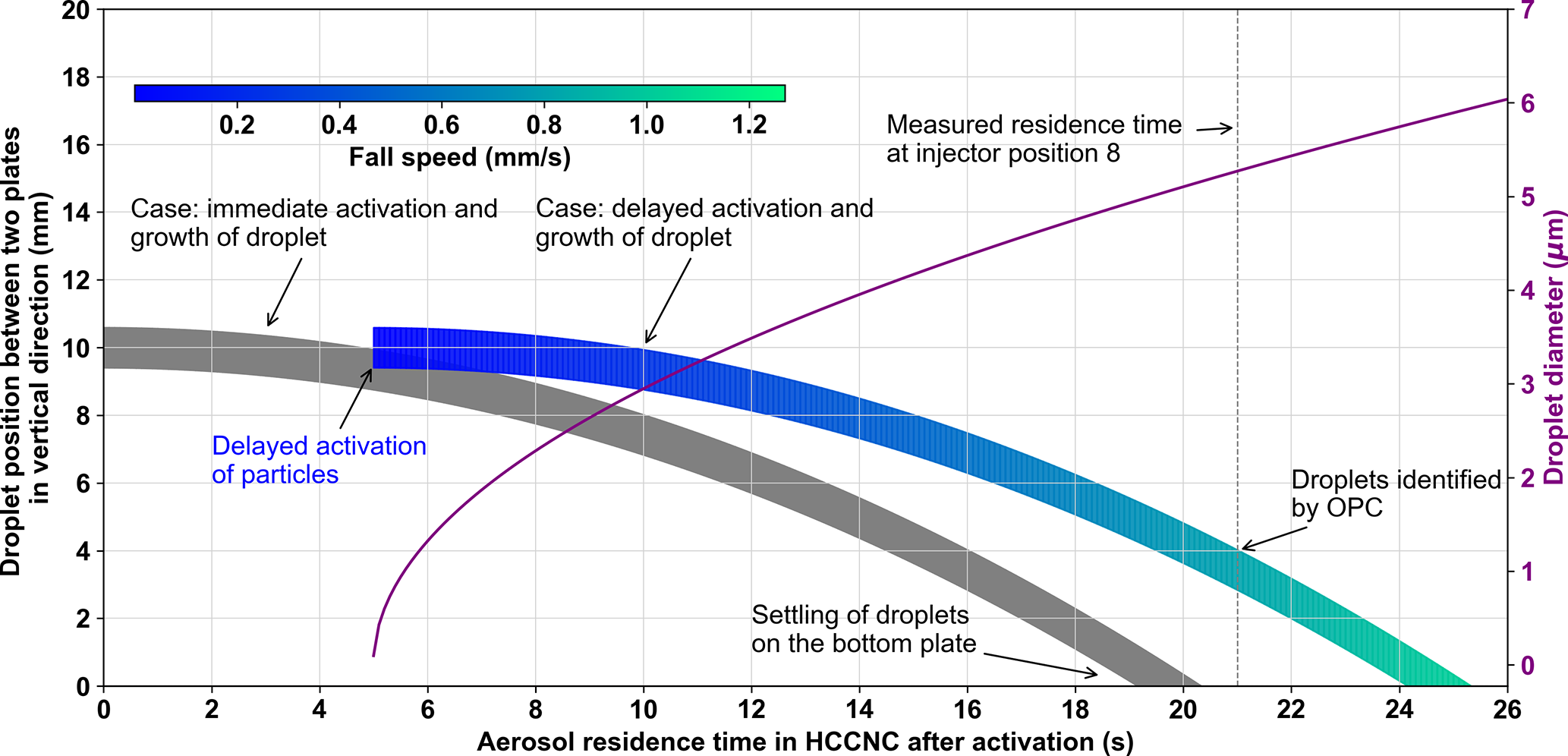 Figure A7Activation, growth and settling of a 97.1 nm ammonium sulfate particle as a function of residence time in a supersaturation environment of 0.15 % in the HCCNC, modelled according to Rogers (1988). The grey strip represents the aerosol and droplet stream upon immediate activation, while the coloured strip corresponds to delayed activation. The primary y axis denotes the vertical position of droplets between parallel plates, with colour indicating fall speed for the delayed activation case. The secondary y axis represents droplet growth. The vertical dashed black line marks the measured residence time at injector position 8 in the HCCNC.