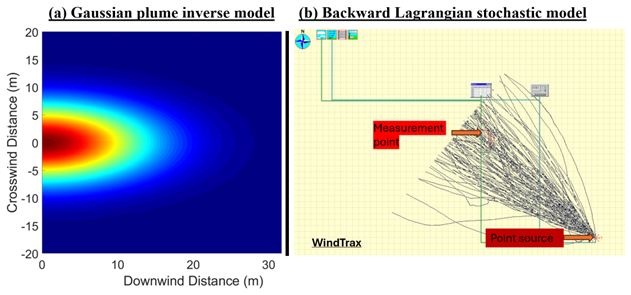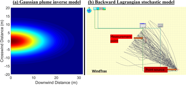 Figure 2(a) A plume that follows a Gaussian plume inverse model, where the emission rate can be inferred from concentrations at different downwind distances and crosswind distances. (b) An illustration of how the backward Lagrangian stochastic model traces particles to the source.