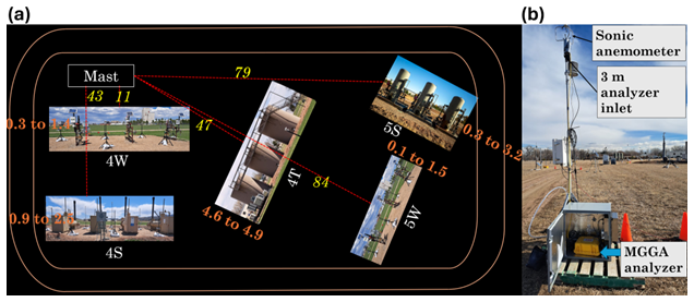 Figure 3(a) Map illustration of major pieces of equipment and the measurement points at Colorado State University's Methane Emissions Technology Evaluation Center (METEC) in Fort Collins, CO, USA. Equipment 4S denotes horizontal separators, 4W is wellheads, 4T is tanks, 5S is vertical separators, and 5W is wellheads. Panel (b) is the measurement point for the microportable greenhouse gas analyzer for the closed-path eddy covariance, Gaussian plume inverse model, and backward Lagrangian stochastic model quantification. The inlet tubing and the sonic anemometer are at 3 m height. The dotted red lines with yellow numbers show the average distances (meters) between the emission equipment and measurement point. The orange numbers show the range of emission heights (meters) for each equipment piece. The analyzers were hosted in a temperature-controlled box.