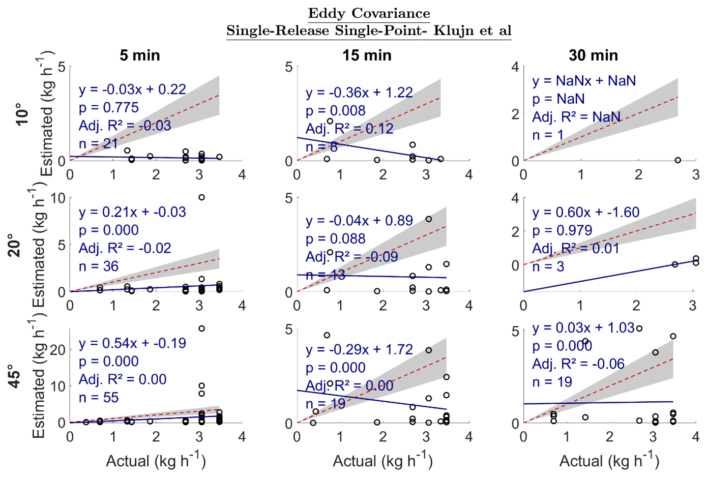 For single-release single-point (SRSP) emissions, the closed-path EC underestimated emissions. Using the Kljun et al. (2015) footprint model, the slope of the linear regression between estimated emissions and actual emissions ranged from −0.03 to 0.54 at 5 min, from −0.36 to −0.04 at 15 min, and was 0.03 at 30 min for 45° (10 and 20° had insufficient data points) (Fig. 4). The adjusted R2 was between −0.06 and 0.12, indicating no linear relationship between the estimated and actual emissions (Fig. 4). Using the Kormann and Meixner (2001) footprint model, the slope was between −0.42 and 0.17 at 5 and 15 min, respectively, and −0.08 at 30 min for 45° (Sect. S3.1.1). Similarly, the adjusted R2 values were between −0.07 and 0.05. These results indicate that this study's EC system using either the Kljun et al. (2015) or the Kormann and Meixner (2001) footprint model did not reliably quantify emissions for SRSP cases. The low slopes and adjusted R2 values suggest little to no linear relationship between estimated and actual emissions under the tested conditions (Fig. 4; Sect. S3.1.1).