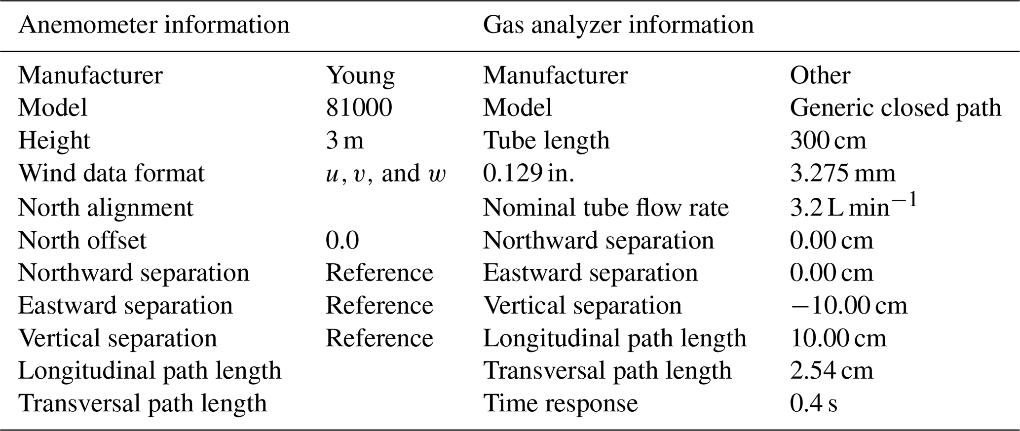 Methane concentration data for the closed-path EC, GPIM, and bLs methods were collected through an inlet tubing (3.275 mm inner diameter) at 3 m height, connected to the ABB (Zurich, Switzerland) GLA131 Series microportable greenhouse gas analyzer (MGGA) set to sample at 10 Hz. The MGGA is a closed-path greenhouse gas analyzer with a ∼ 3.2 L min−1 pump flow rate, 10 cm cell length, 2.54 cm cell diameter (∼ 0.23 sccm (standard cubic centimeters per minute) effective volume), and 0.4 s gas flow response time. The inlet tubing was collocated with an R. M. Young (Traverse City, MI, USA) 81000 sonic anemometer, which measured micrometeorology at 10 Hz (Fig. 3B). The northward, eastward, and vertical separation of the inlet tubing from the sonic anemometer was 0, 0, and −10 cm, respectively.