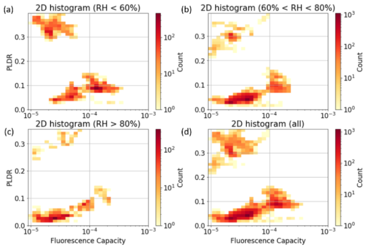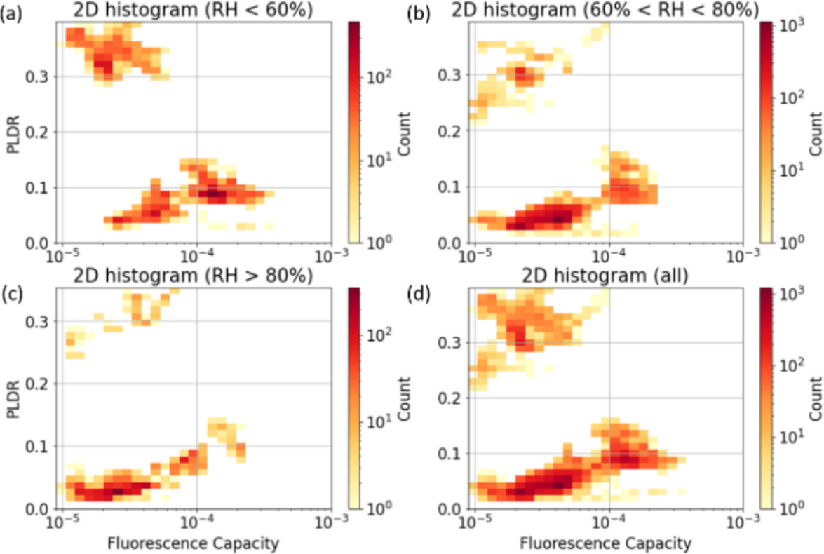 Figure 22D histograms of the training set containing hand-selected data of pure cases as a function of the RH levels: (a) below 60 %, (b) between 60 % and 80 %, (c) over 80 %, and (d) all data.