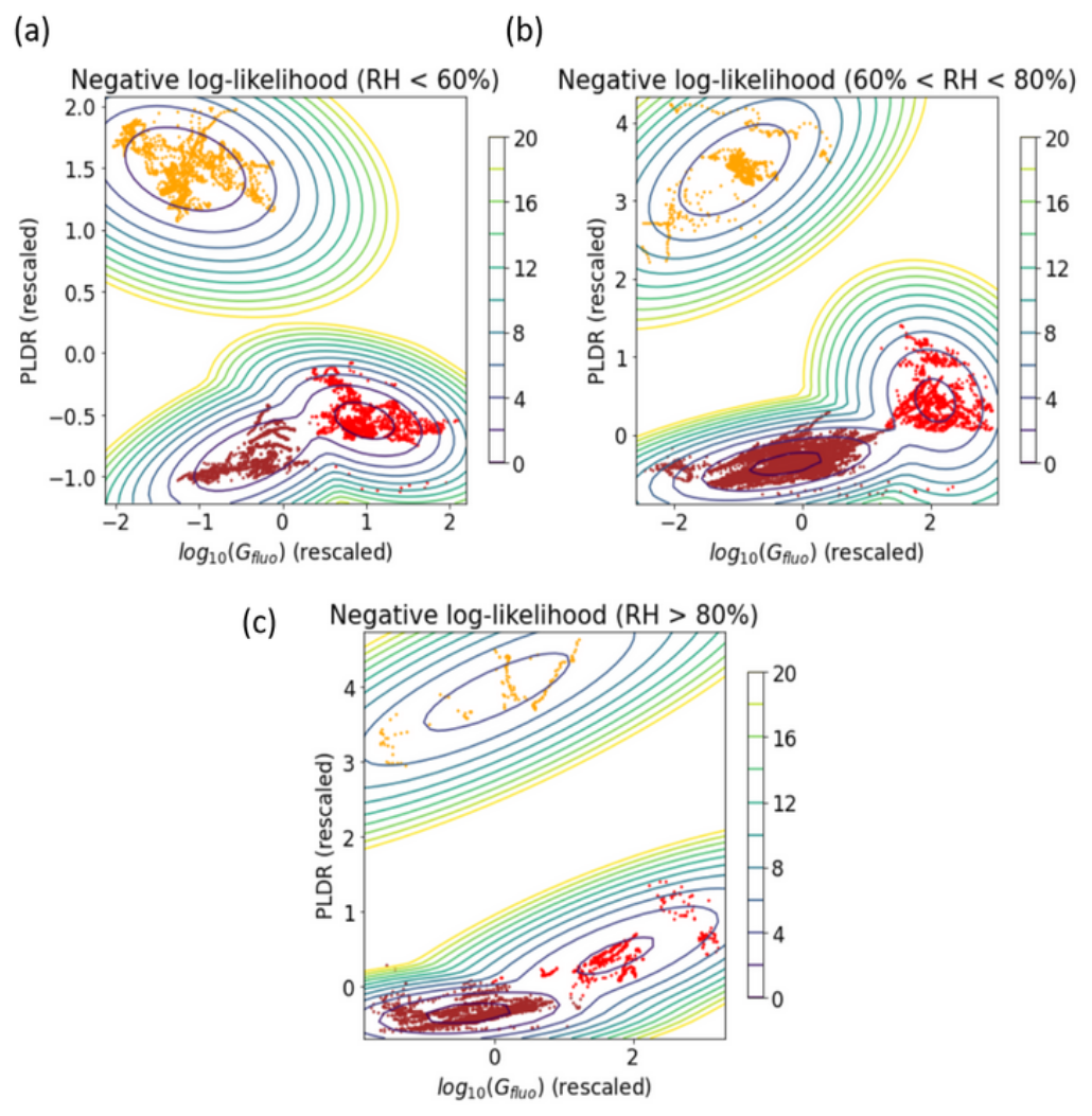 A next step is to pre-process the data. The fluorescence capacity can vary on very large ranges (between 9.10−6 and 10−3) compared to PLDR and RH, which typically vary within a single order of magnitude. This wide variation implies that some information may be lost during the rescaling process. To mitigate this effect, the base-10 logarithm of Gfluo has been used as a feature for the GMM training. In this way, the range of Gfluo is squeezed, reducing the disparity with other variables. Afterward, the training set has been rescaled by retracting the mean of the dataset and dividing by the variance to ensure that each variable contributes equally to cluster identification. This rescaling step is crucial, as it balances the influence of each variable in GMM, allowing the model to more effectively identify clusters without being dominated by any single variable.