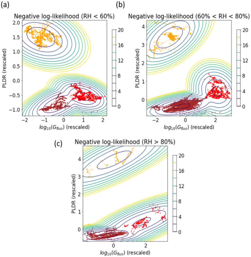 Figure 4Data repartition of the training set sections with the different versions of FLARE-GMM trained on these sections: (a) section with RH <60 %, (b) that with 60 %< RH <80 %, and (c) that with RH >80 %. Each color is associated with a Gaussian distribution determined by FLARE-GMM, with the representation of the negative log-likelihood contour lines (−ln (P(x))).