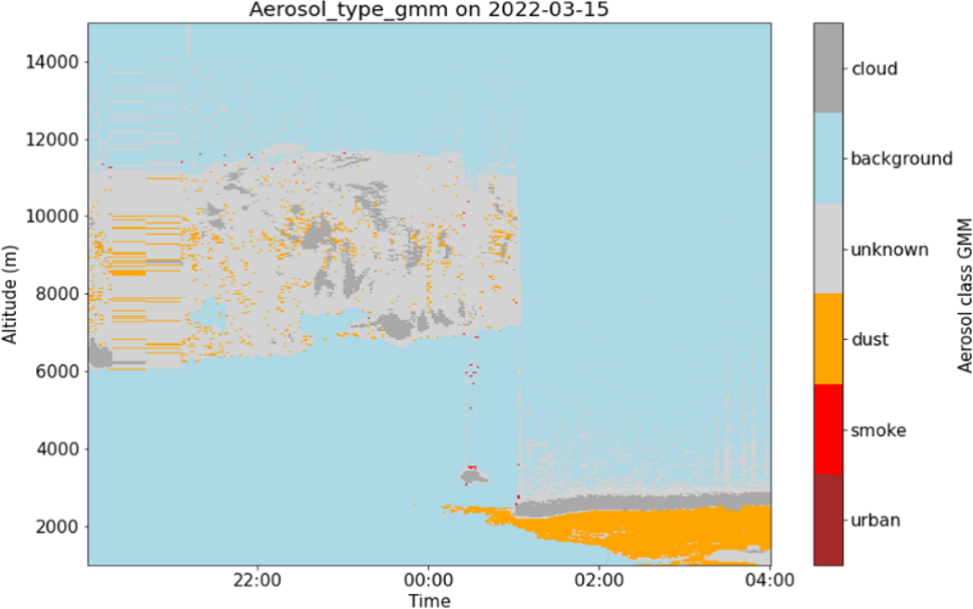 Figure 5FLARE-GMM aerosol type estimation quick look during the night between 15 and 16 March 2022 between 1000 and 15 000 m.