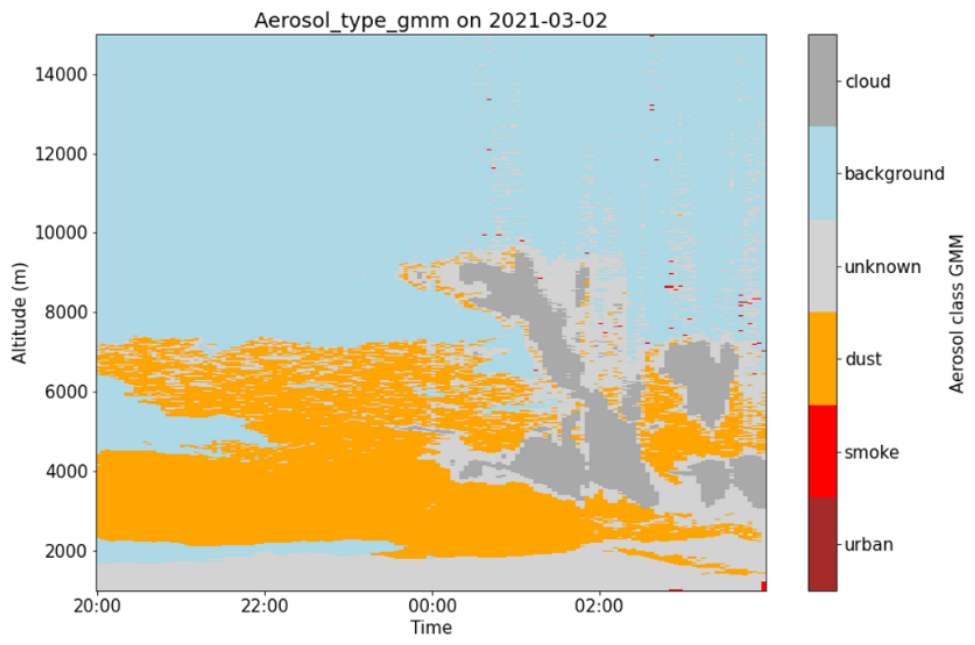 Figure 6FLARE-GMM aerosol type estimation quick look during the night between 2 and 3 March 2021 between 1000 and 15 000 m.