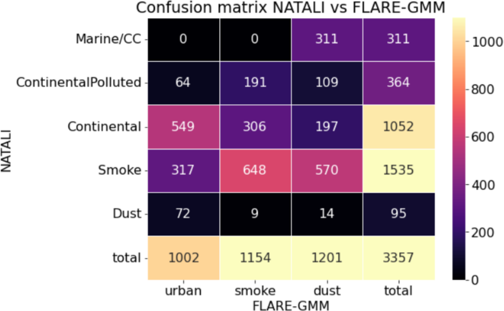The confusion matrix indicates that the agreement rate between the two models is at 38 %. This rate is encouraging given that the two models use different features for classification and differ in their algorithmic structure. Indeed, NATALI is a supervised learning algorithm, whereas FLARE-GMM is unsupervised. Regarding the disagreements between FLARE-GMM and NATALI, we can first evidence the confusion that exists between smoke and urban, or continental, aerosols. Indeed, in a substantial number of cases, NATALI and FLARE-GMM disagree between smoke and urban aerosols. This confusion was expected because the optical properties of smoke and urban aerosols are close, as evidenced in the former section.