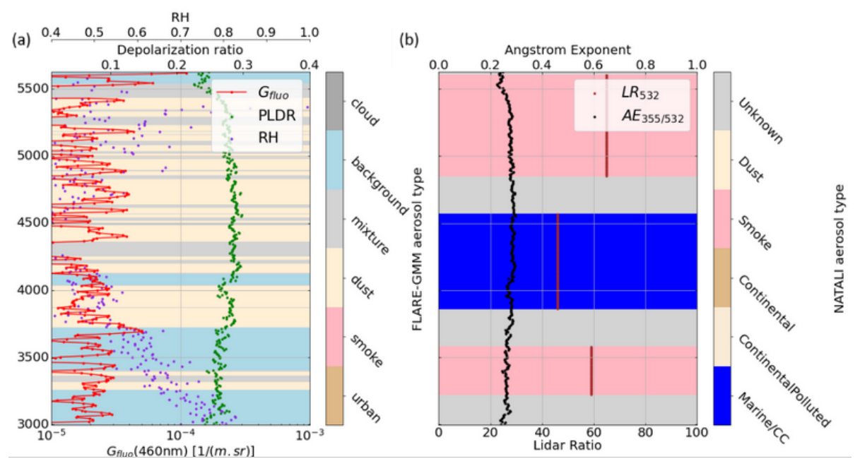 Figure 9LILAS lidar profiles on 21 March 2022 at 21:00 UTC and comparison between FLARE-GMM and NATALI aerosol type estimations.