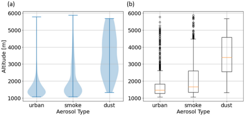 Figure 10(a) Violin plots and (b) box plots of averaged altitude distributions between 1 and 6 km above ground level as a function of the aerosol type for all the available data from 2021 to 2023.