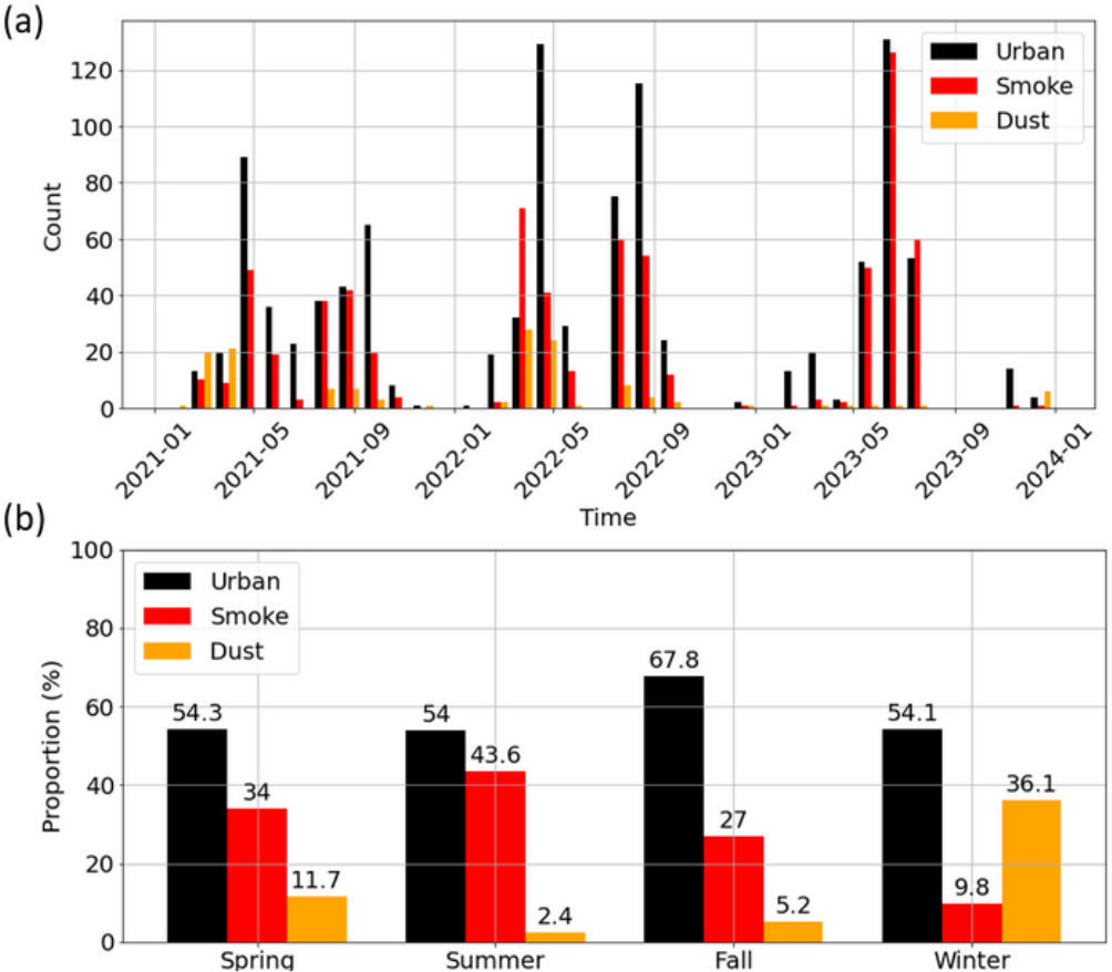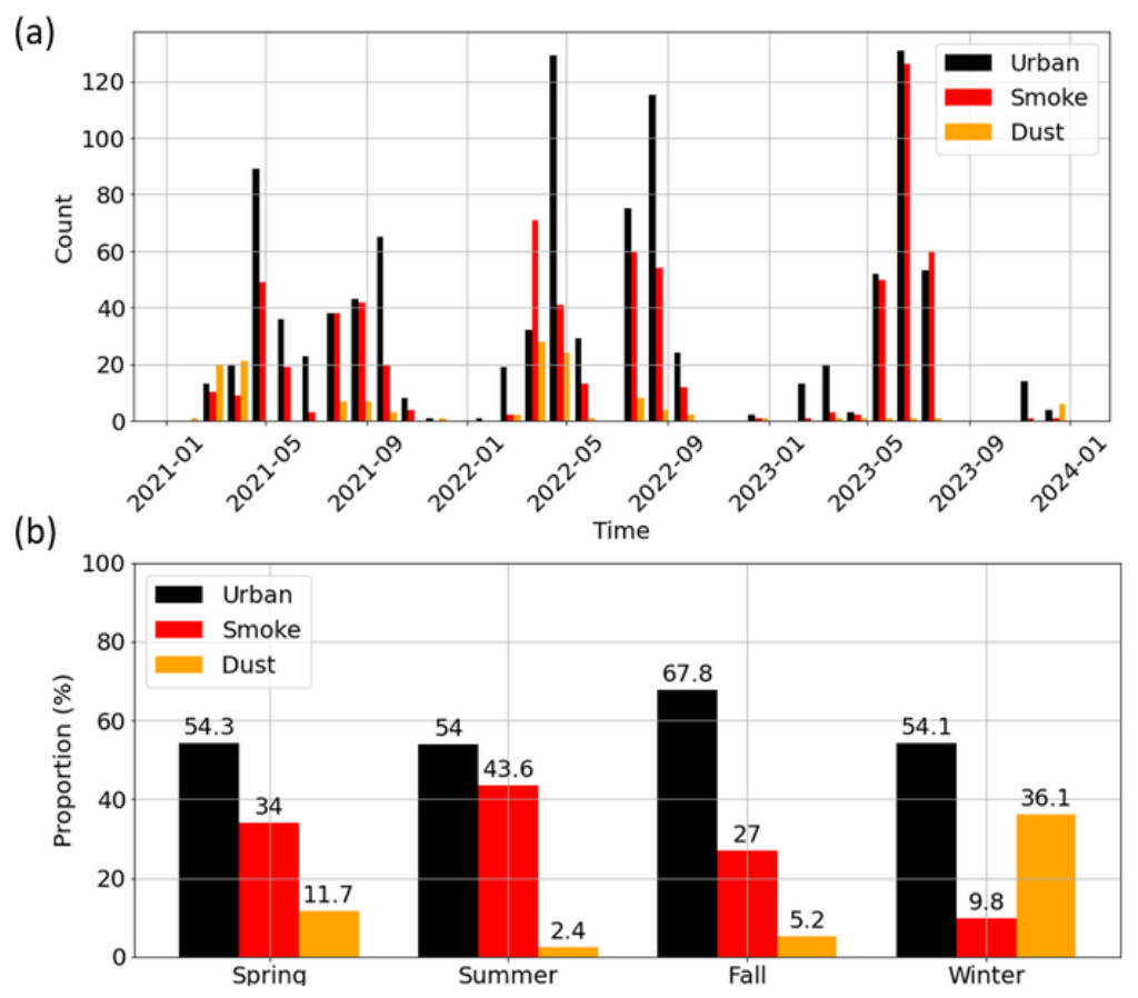 Figure 11(a) Histogram of aerosol type estimates from FLARE-GMM as a function of time, and (b) the share of each aerosol according to the season, with all data from 2021, 2022, and 2023 below 6000 m above ground level.